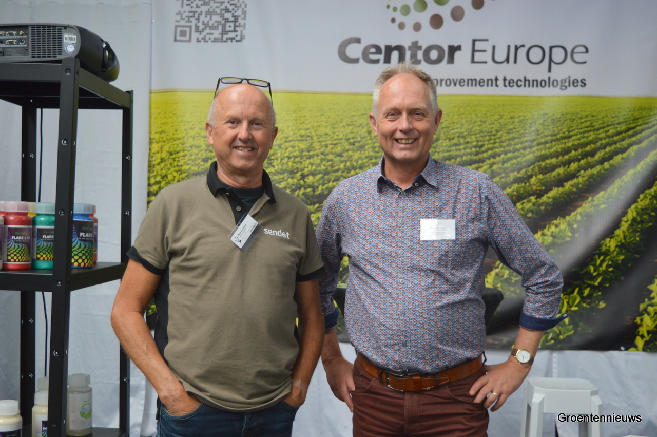Arie Draaijer van Sendot op de foto met Matthé Bleeker van Centor Europe. Centor ontwikkelt coatings, maar verkoop ook machines voor zaadtechniek, waaronder die van Sendot.