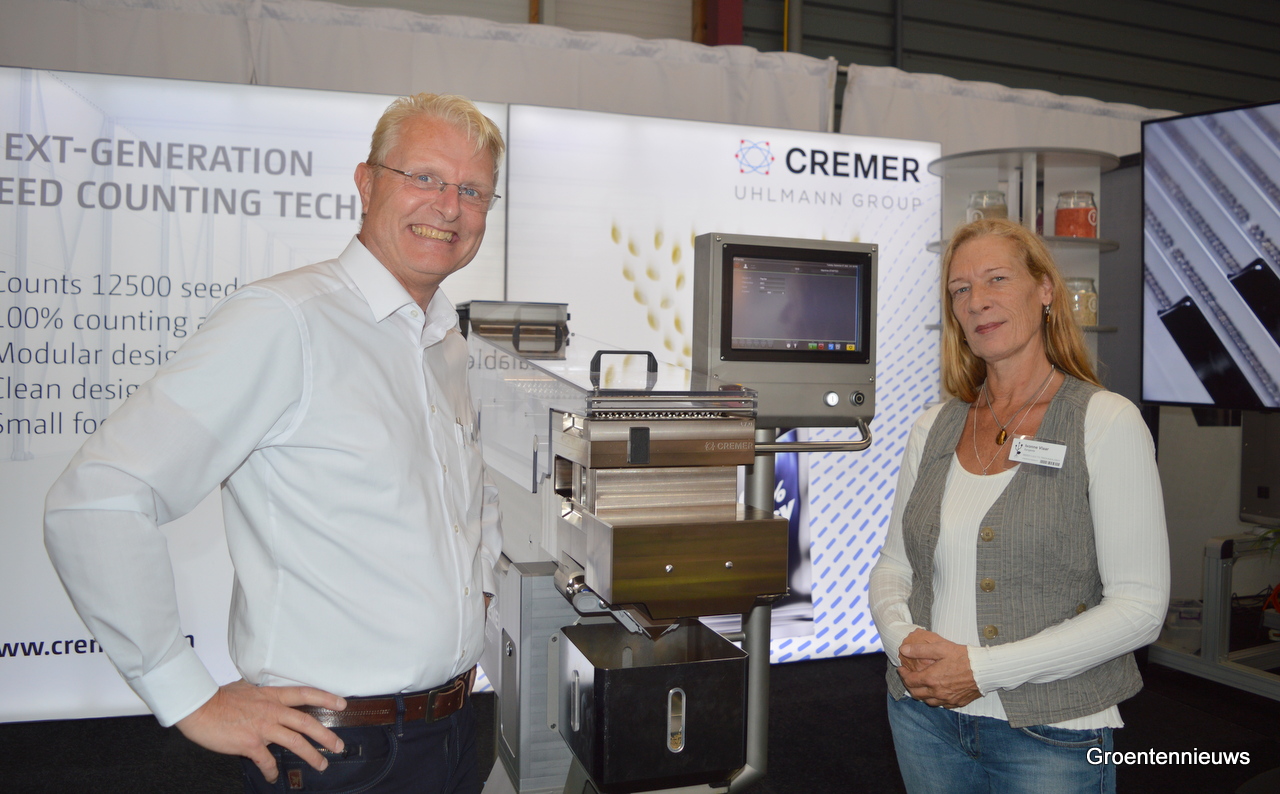 Walter Hermans van Cremer Speciaalmachines is blij, want met Ivonne Vlaar van Syngena kwam een tevreden gebruiker van zijn zaadtelmachines langs.
