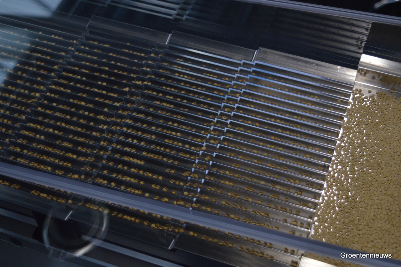 Inmiddels gaan de zaden netjes in gootjes om geteld te worden, zowel hier op de beurs als bij Syngenta