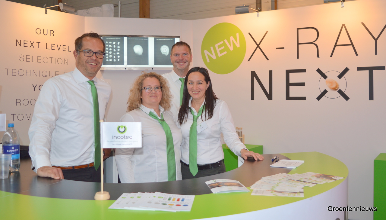 Een teamfoto bij Incotec, dat een update van de X-raytechniek meebracht naar de beurs. Kunstmatige intelligentie is aan de techniek toegevoegd, waarmee het nog beter mogelijk is zaden te sorteren voor zowel paprika als gewone en, nieuw sinds dit jaar, onderstamtomaten.