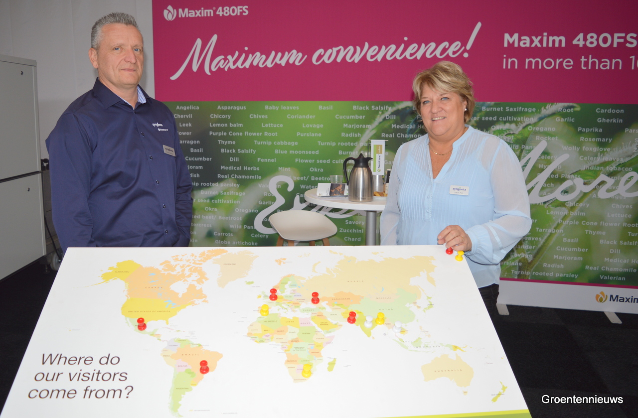 Ruud Roeven en Karin Plat van Syngenta Seedcare vertelden dat er van over de hele wereld bezoekers waren op de beurs die op zoek waren naar een alternatief voor zaaizaadbehandeling met Thiram. Steeds meer chemische middelen worden verboden en dat maakt dat telers veel vragen hebben over wat er wel kan én mag. Syngenta bied Maxim aan voor gebruik in 160 gewassen.
