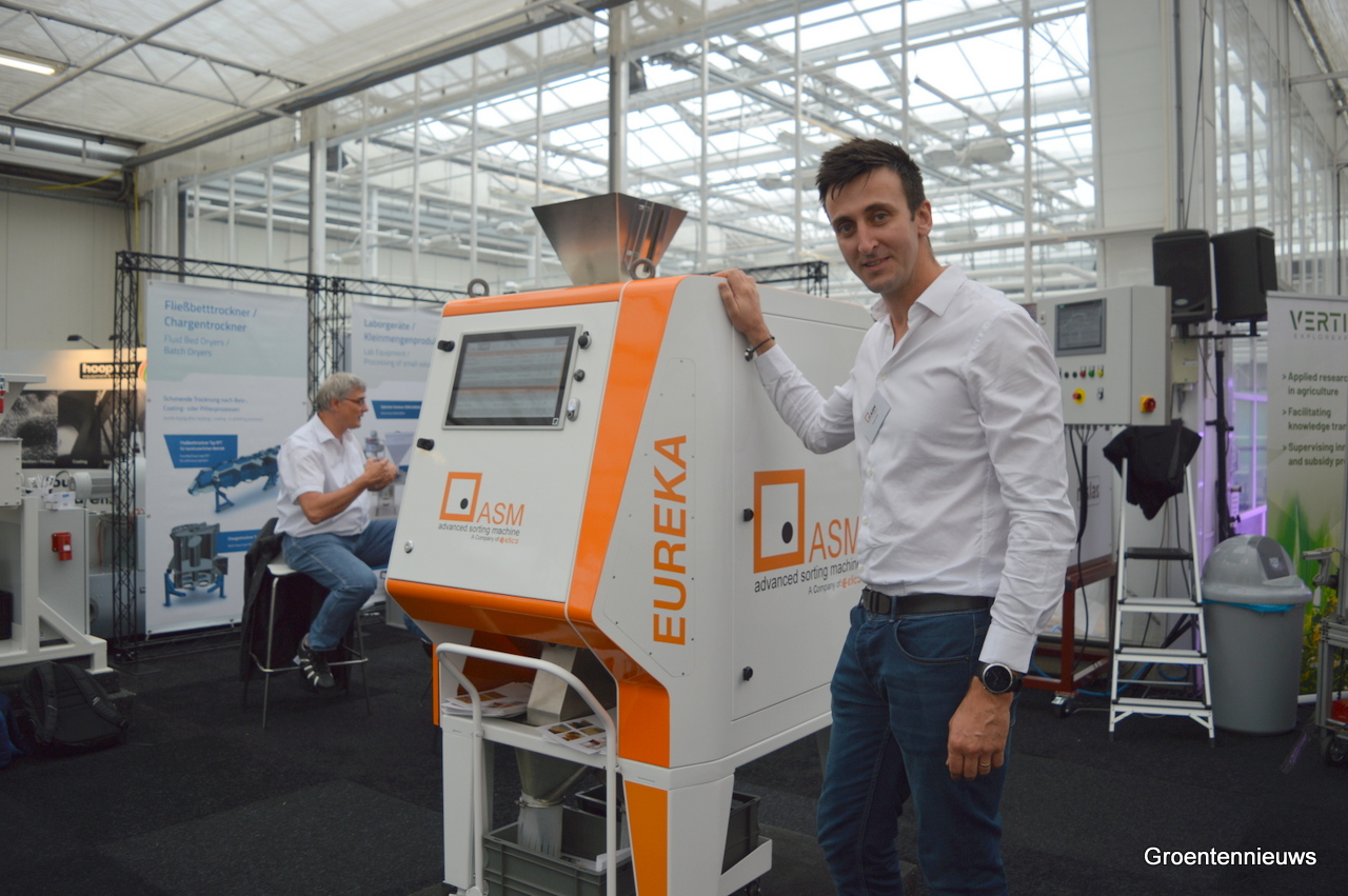 Joseph Tardy van ASM, met op de achtergrond Mathijs Wuts van Niklas, naast een kleursorteermachine voor zaden die is uitgerust met infraroodtechniek. Joseph staat hier naast een klein formaat.