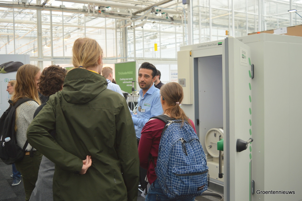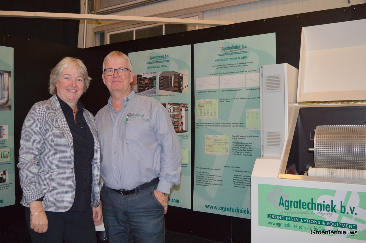 Silvia Neuvel en Jan Appelman van Agratechniek vertelden op de beurs onder meer vragen te hebben gekregen over gecontroleerd drogen van zaden op gewicht.