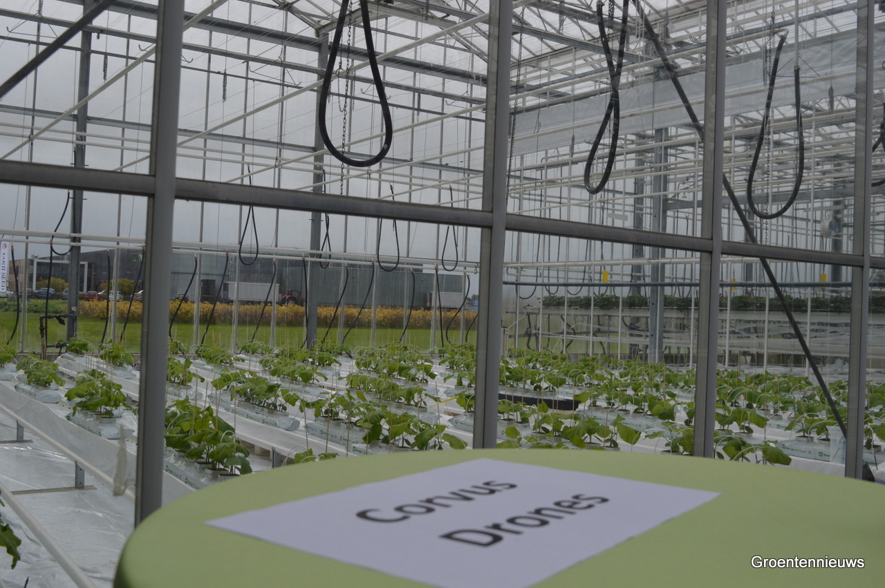 Naast veertig standhouders waren er ook ruim tien bedrijven die gebruik maakten van een ‘handelstafel’. Een van hen was Corvus Drones. In de kas op de achtergrond (nog) geen drone van het bedrijf dat inmiddels meerdere drones door kassen heeft vliegen.