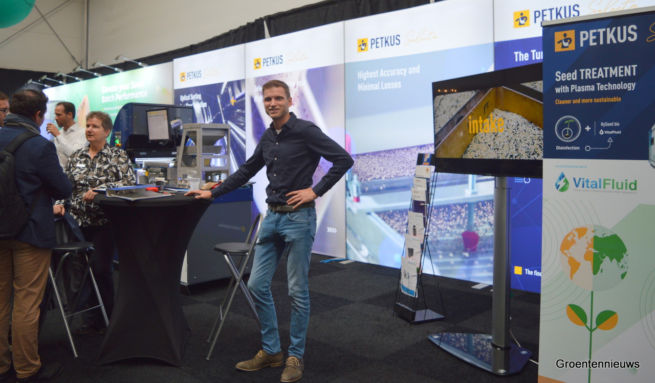 Mark van Boxtel van VitalFluid stond in de stand bij Petkus, met op de achtergrond in wit Marcel Wolbrink en meer naar voren Ineke Wijkamp. De beide bedrijven werken samen aan zaadbehandeling met de ‘bliksemtechniek’ van VitalFluid. Het doel is de techniek op grote schaal toe te passen voor zaadbehandeling. Petkus kan dan machines daarvoor ontwikkelen.