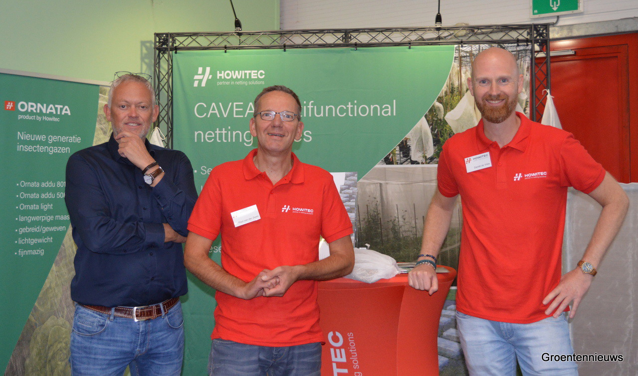 Marco Anneveldt, Paul van der Zwan en Daniël de Vries van Howitec gingen op de foto na het geven van uitleg aan een klant over net- en gaasoplossingen en het uitdelen van een sample.