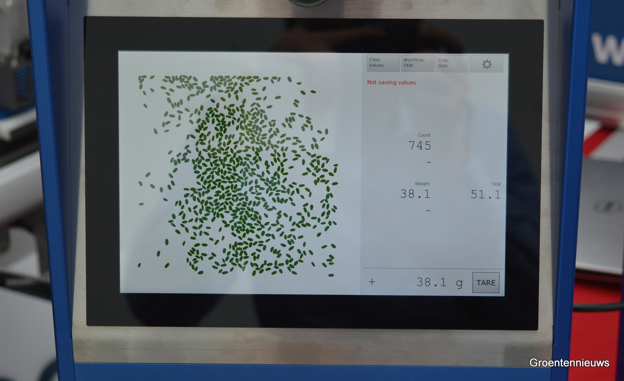 … 745 om precies te zijn, goed voor 38,1 gram. Met nog 255 zaden erbij komt het duizendkorrelgewicht dan uit op 51,1 gram. Bijzonder is dat de techniek ban Balkema Technologies plug&play is. “Je zou de machine zelfs op je laptop of mobiele telefoon aan kunnen sluiten.”