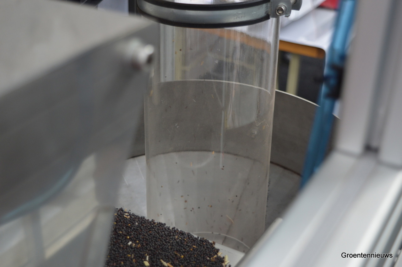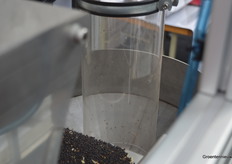 Het kennersoog ziet dat de machine van OPTOmachines uitgerust is met een ronde kolom voor een betere luchtbeweging. Daarmee is de machine accurater dan anderen, aldus François. Slechte zaden worden omhoog geblazen, goede zaden vallen naar beneden en worden daar verzameld.