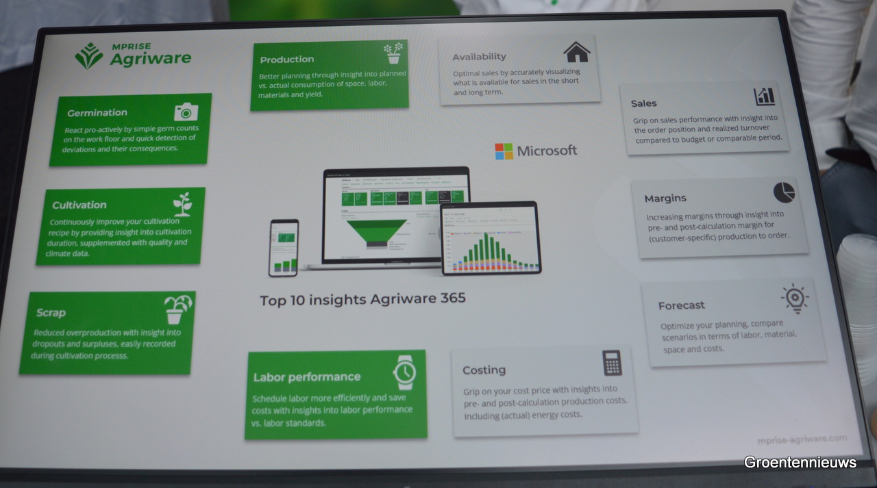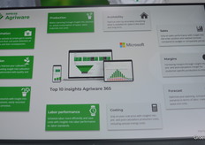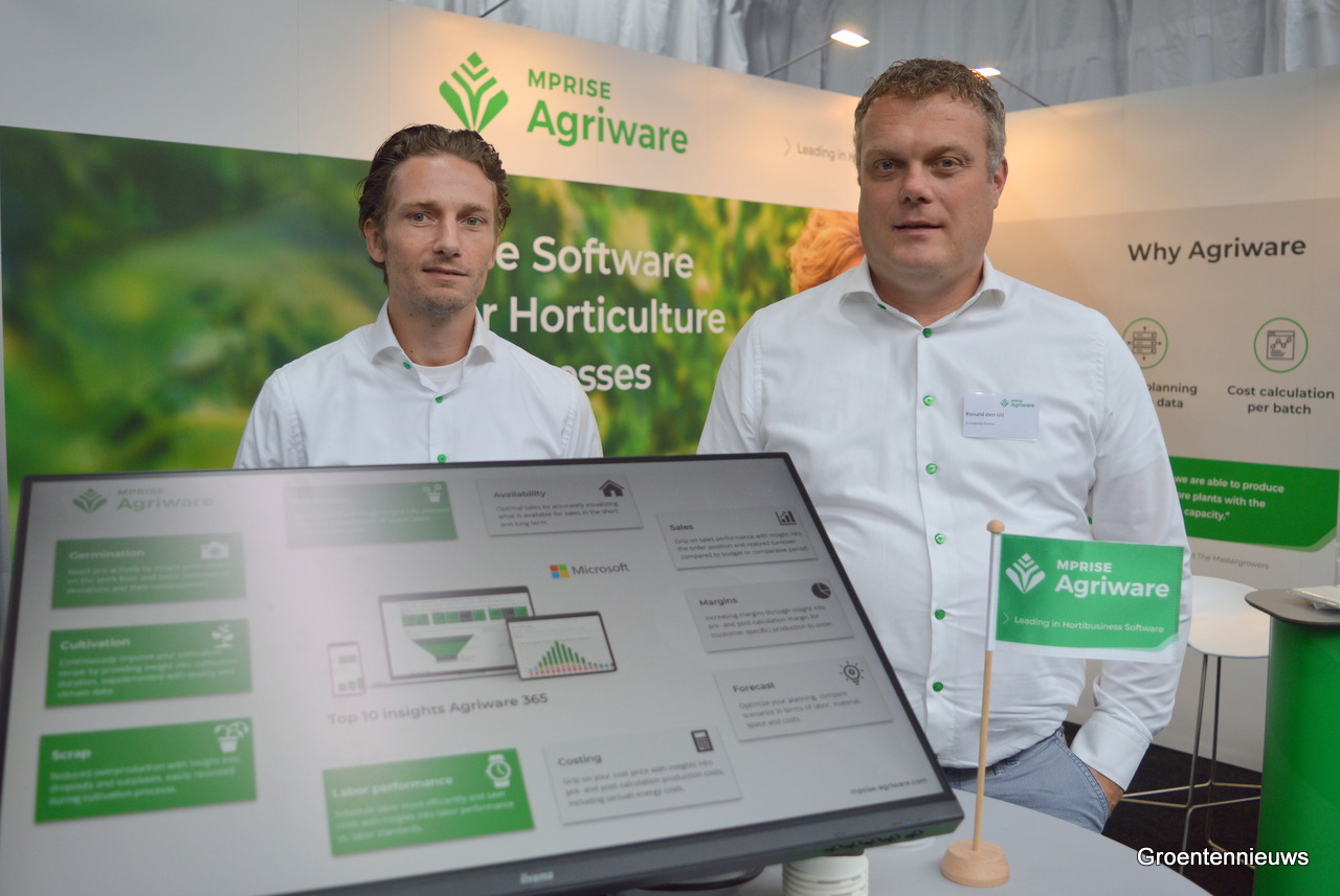 Michael Zomerdijk en Ronald den Uil van Mprise Agriware lieten zien hoe het bedrijf data steeds beter weet te presenteren voor gebruikers. Tegenwoordig worden er tien standaard inzichten meegeleverd bij data, zoals te zien was op het scherm waarvoor de mannen staan.
