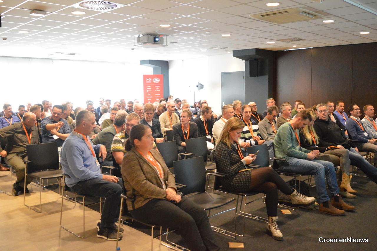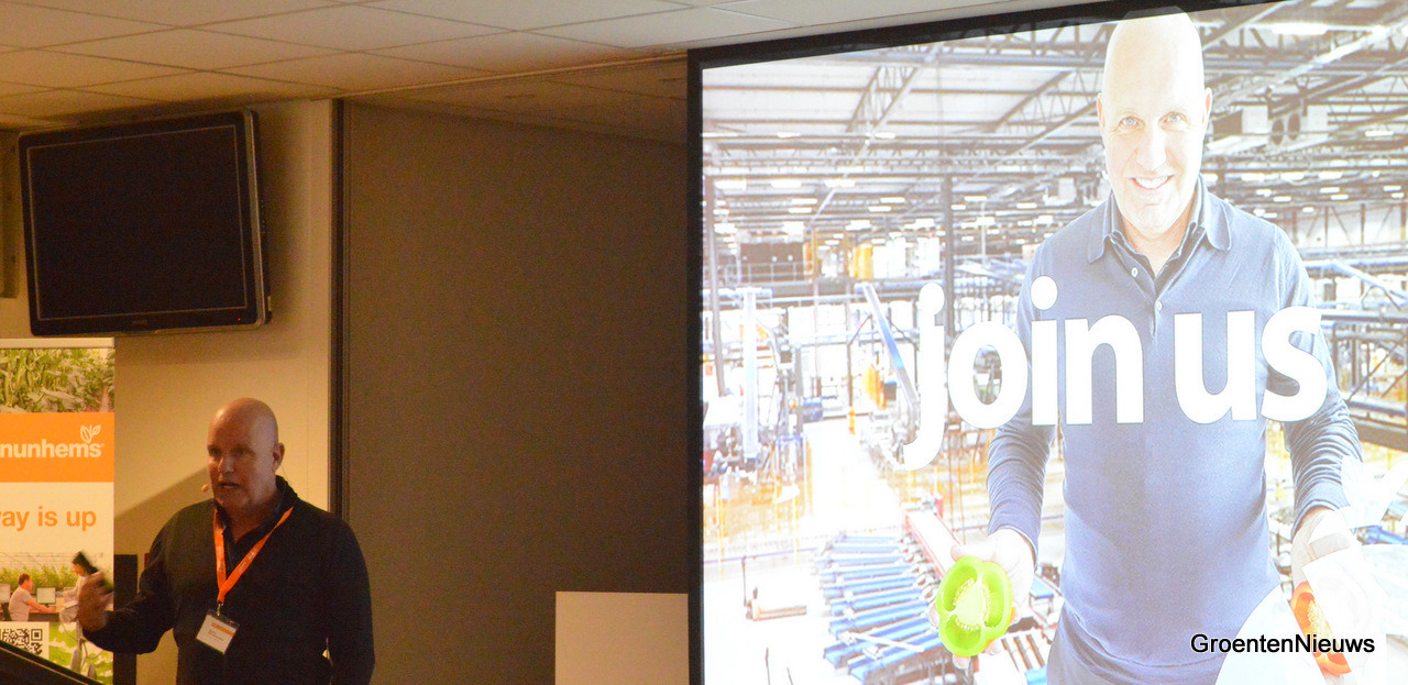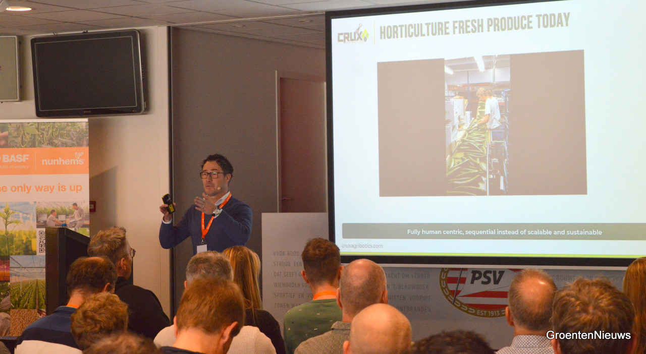 Richard Vialle van Crux Agribotics liet video's zien van twee robots. De SortiPack draait al in de praktijk bij telers om komkommers te sorteren en te verpakken. Een oogstrobot moet over drie jaar seriematig op de markt komen.
