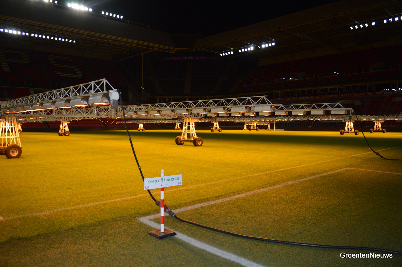 De lampen verwarmen het gras. Het gras moet blijven groeien, zodat het continu afgemaaid kan worden op 2,2 centimeter.