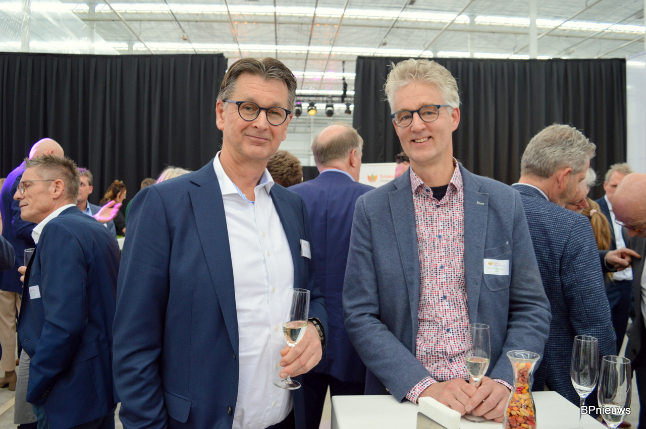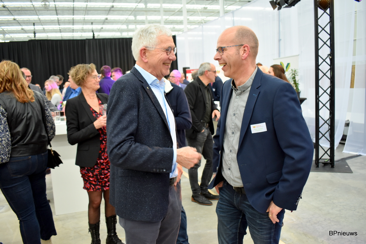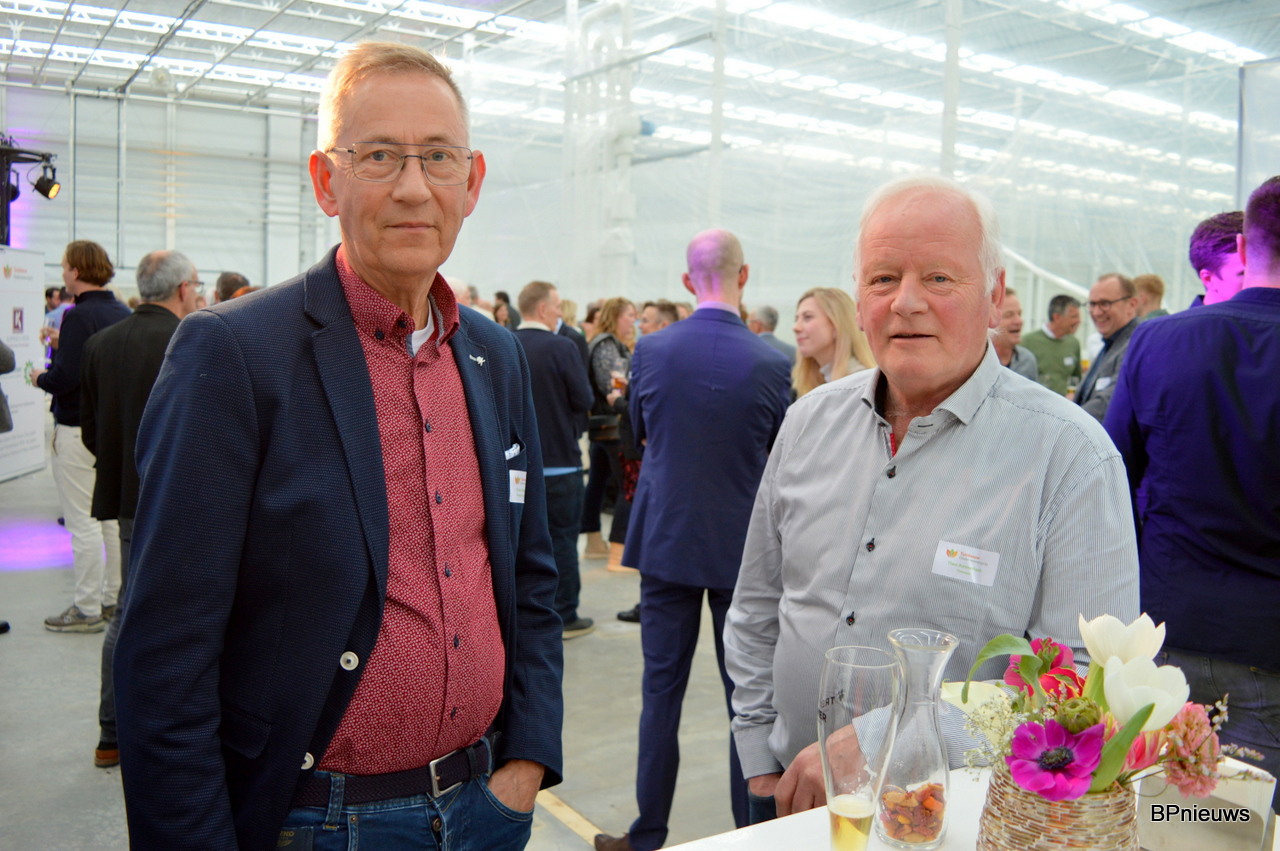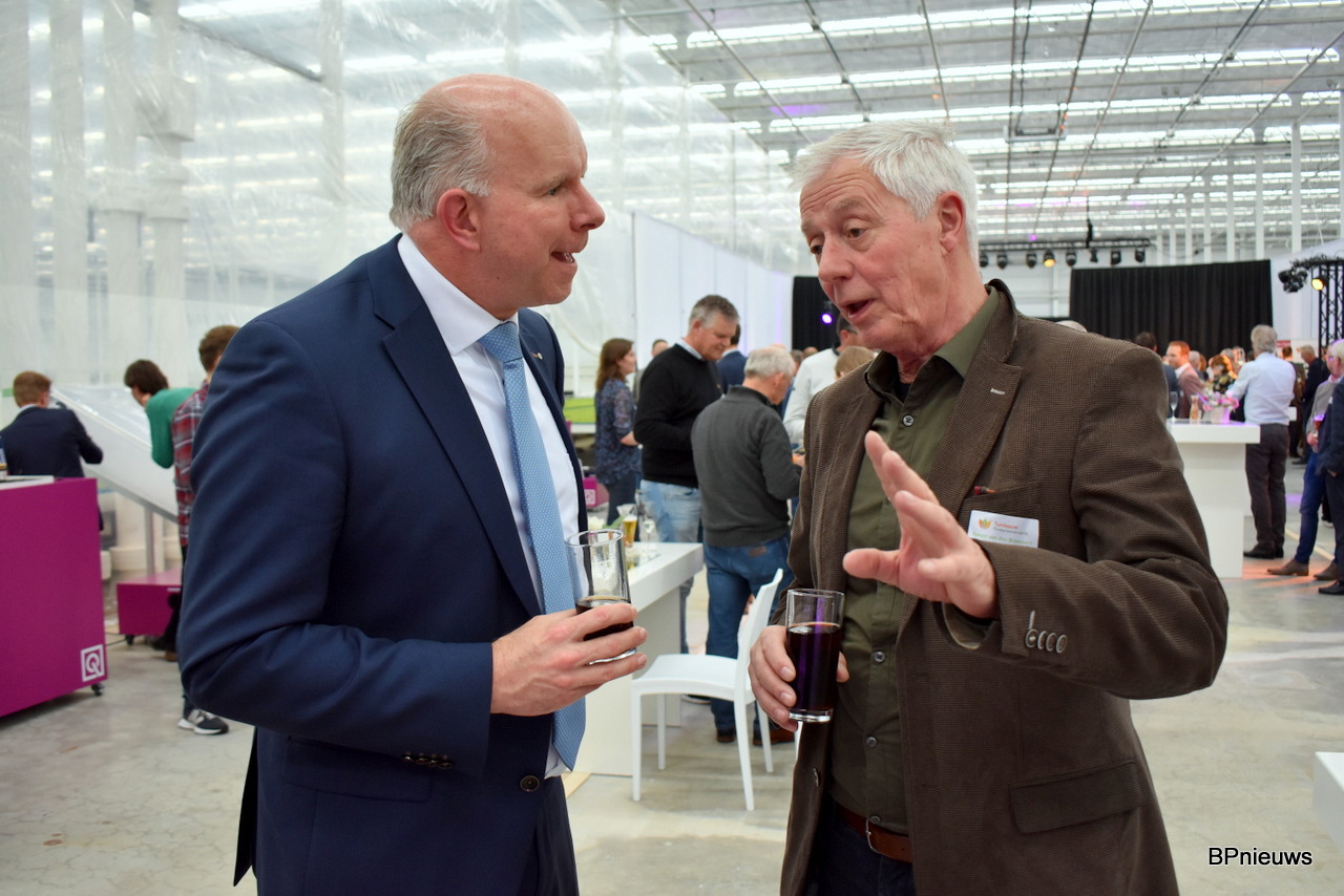 Pieter Varekamp van Gemeente Westland en Ronald van den Breevaart van Greenport Aalsmeer druk in gesprek.