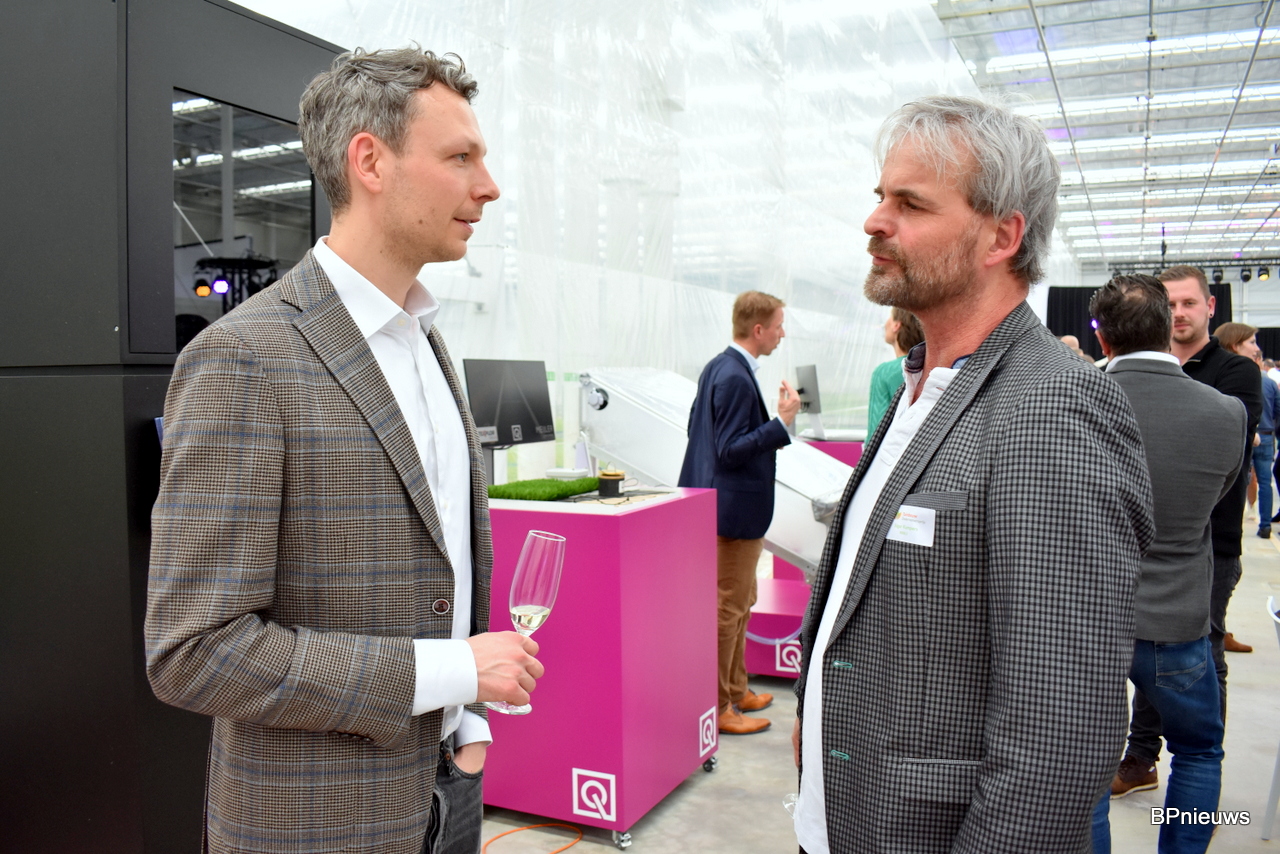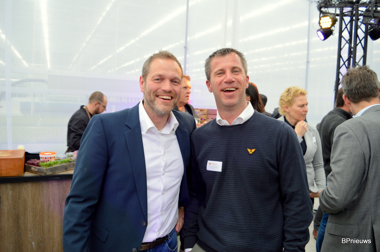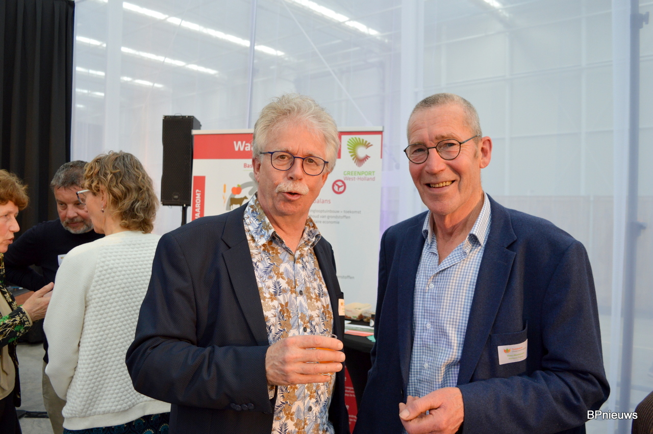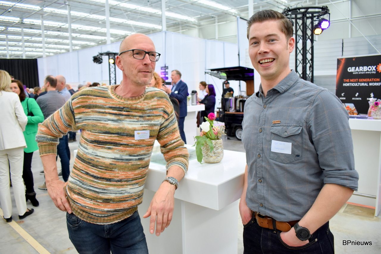 Pieter Varekamp van Gemeente Westland en Ronald van den Breevaart van Greenport Aalsmeer druk in gesprek.