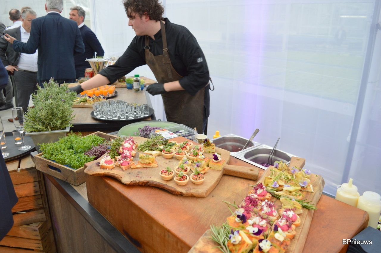De dames van de catering brachten echte traktaties rond, waaronder dit: een meloen likeurtje met een raadselachtig plantje uit de keuken van Koppert Cress dat een frisse, tamelijk heftige tinteling in de mond geeft.