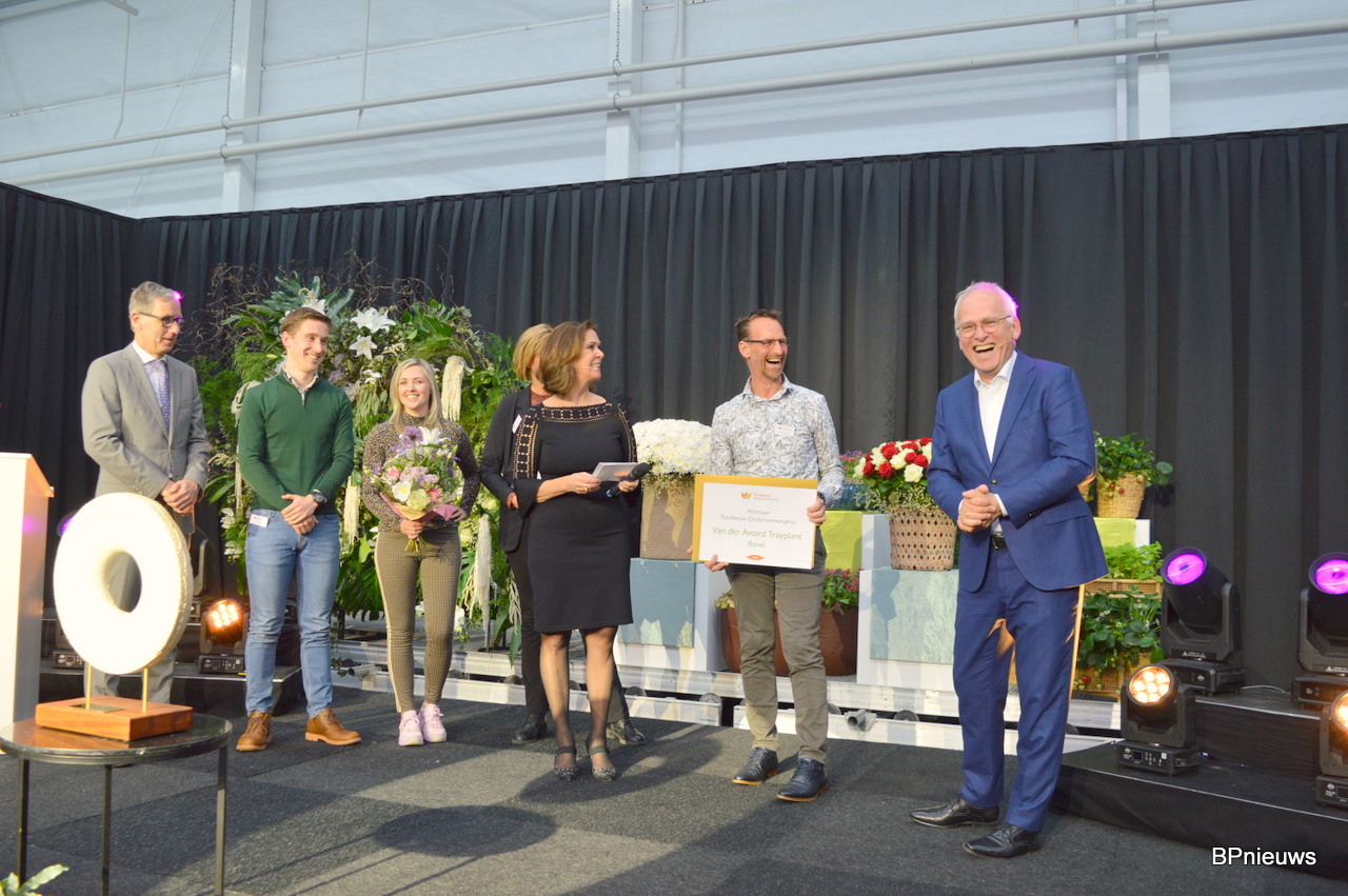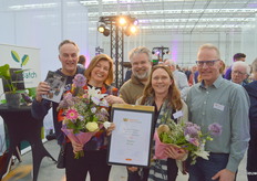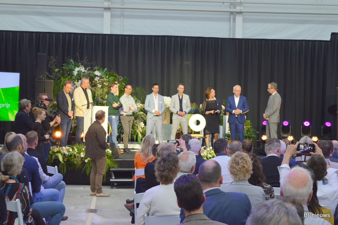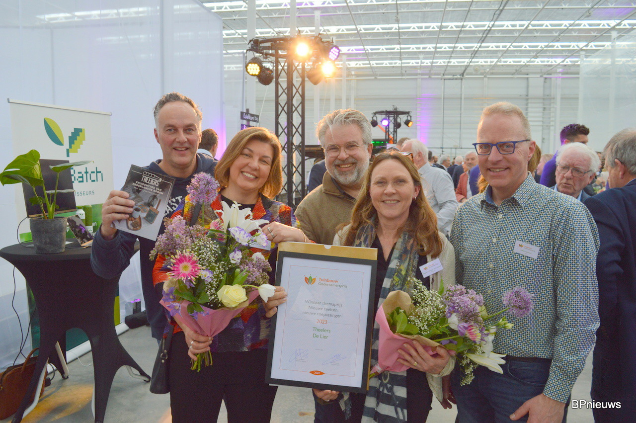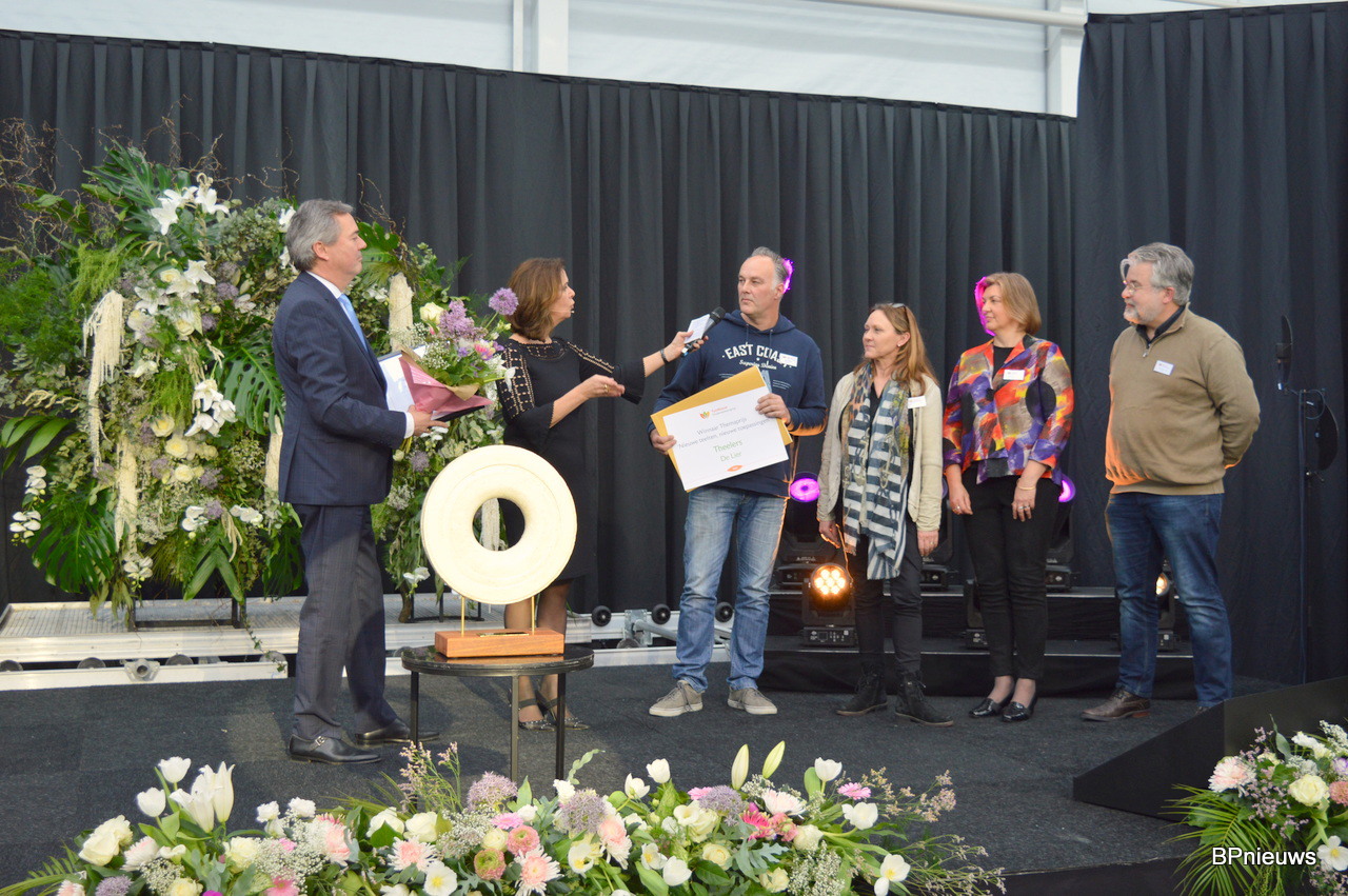 Pieter Boekestijn neemt, namens de vier telers van Theelers en uit handen van directeur van Greenport West Holland Meindert Stolk (uiterst links), de innovatieprijs in ontvangt.