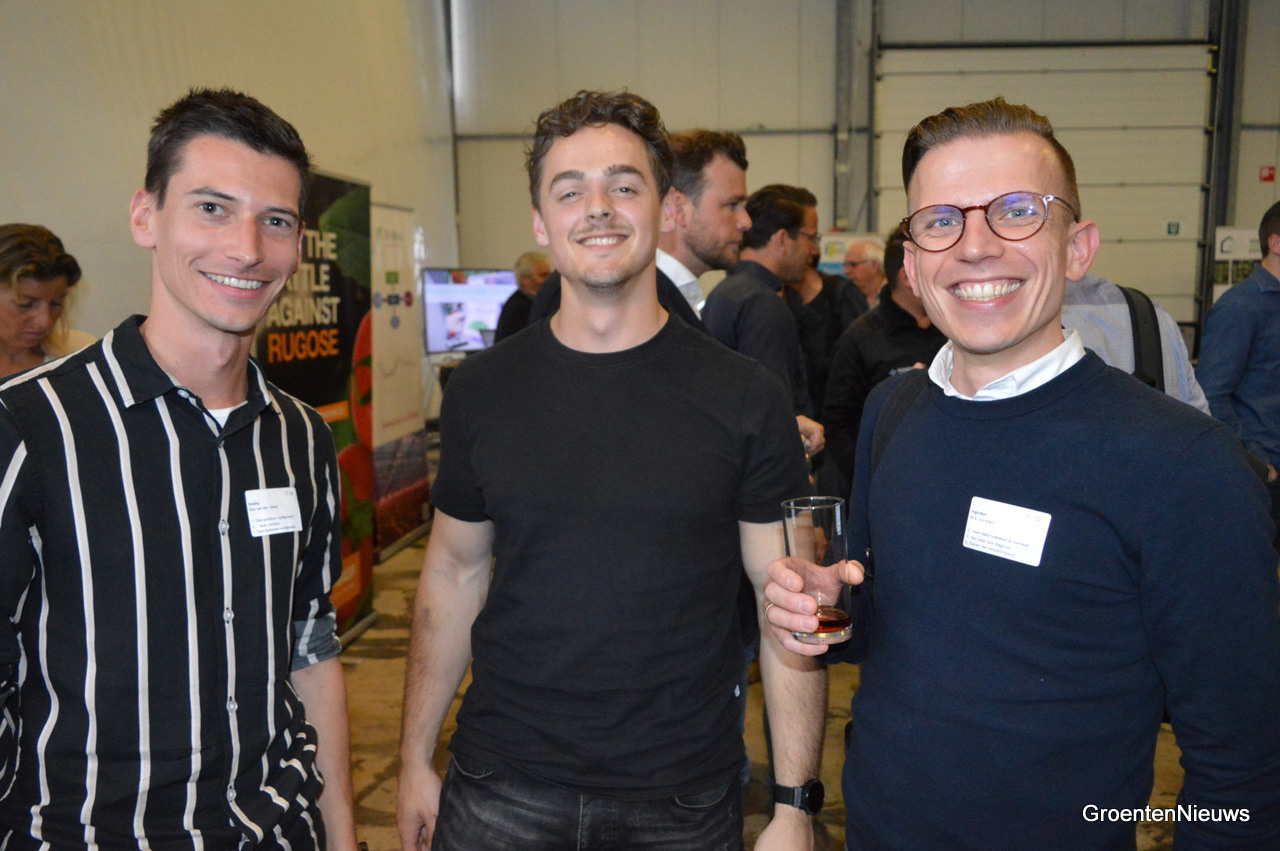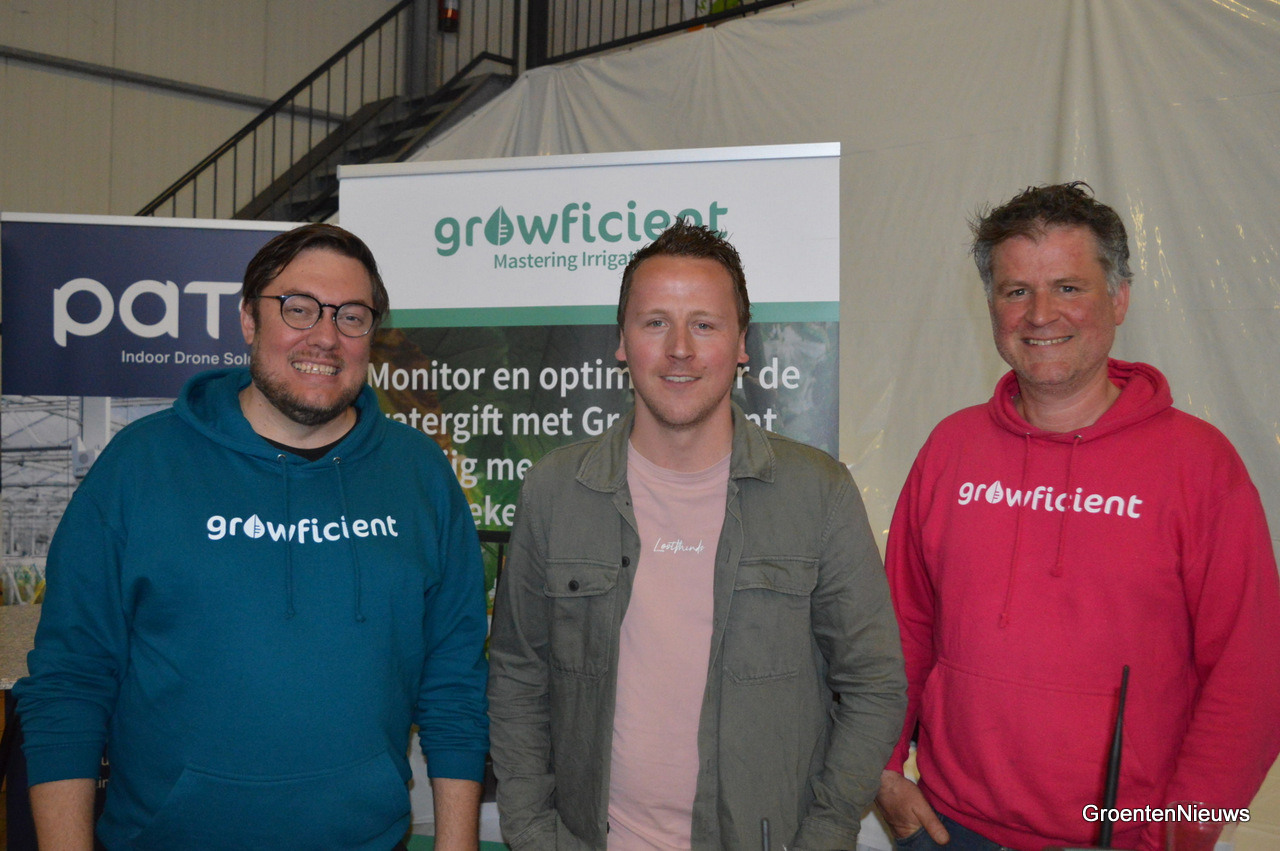 Dennis Steentjes, Tomothy van der Toorn en Dirk-Jan Mulder van Growficient. Zij ondersteunen telers om irragatie te optimaliseren door hun sensoren en software in te zetten op substraatteelten.