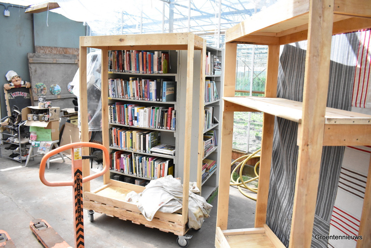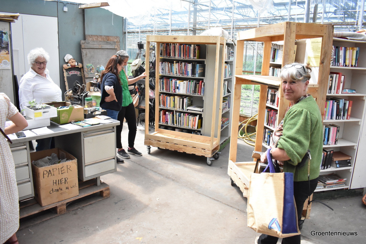 Er staan boeken in een kast die bezoekers kunnen lenen