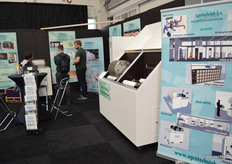 Marvitech probeerde de laatste oudere machines (rechts op de foto) te verkopen, terwijl in het midden de geüpgrade versie van de machine die zaadhelderheid detecteert ook te zien was. Op de foto: Tobias Gagzow en Thomas Stumpe.