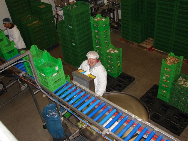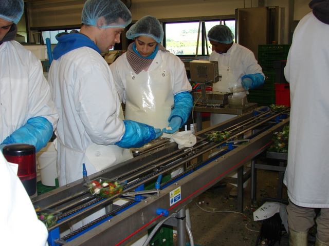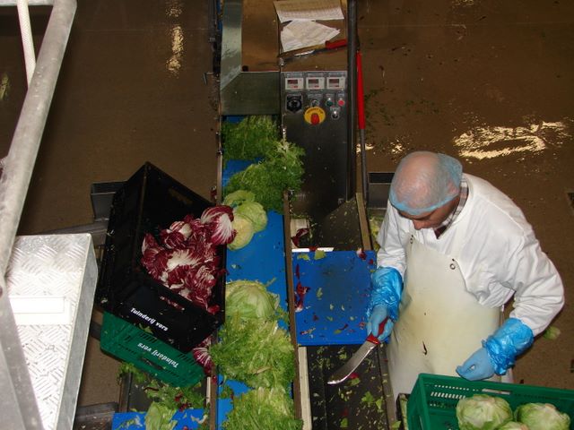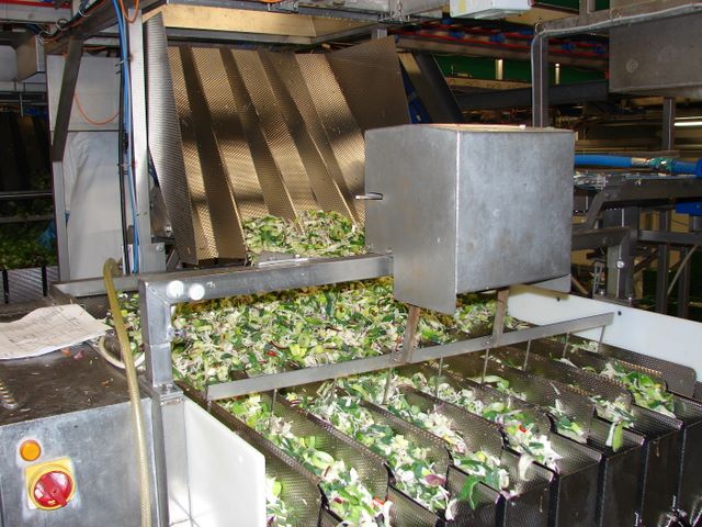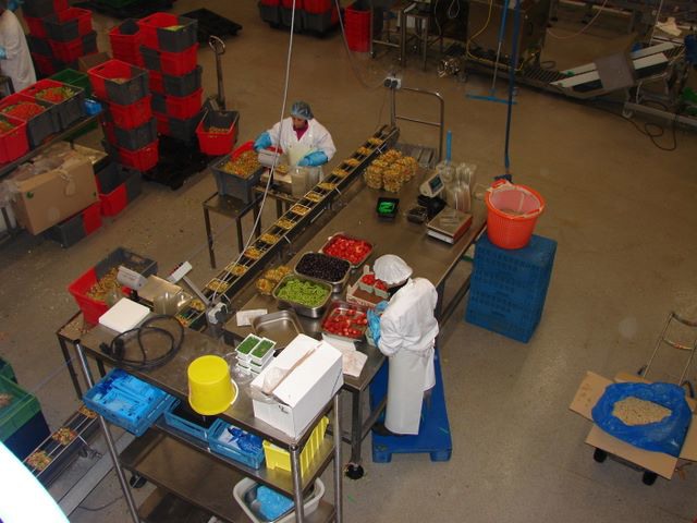De bakjes kant-en-klare salade worden hier met de hand gevuld.