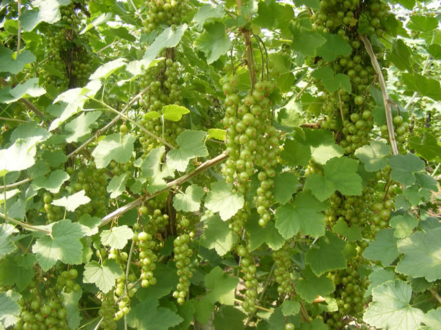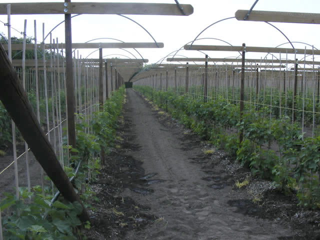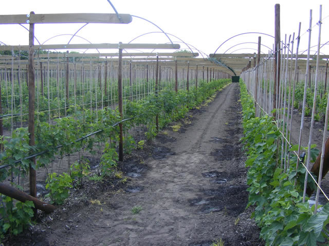 Volle trossen bessen in de overkapte plasticteelt.