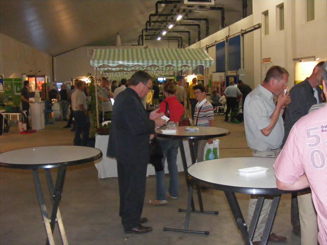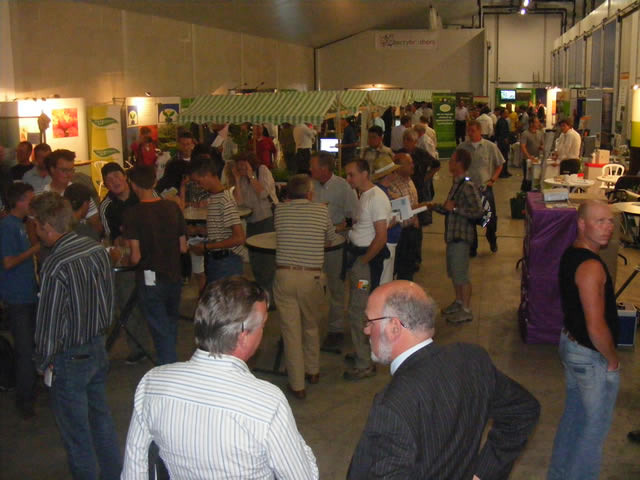 Overzicht van de bedrijfsruimte met de info-stands.