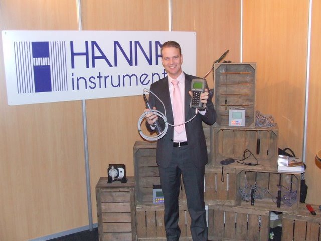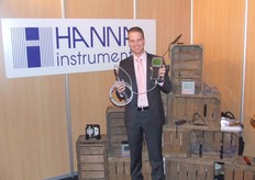 Jan Willem Timmerman toont een apparaat waarmee de PH, EC, zuurstof, temperatuur in 1 probe wordt gemeten en opgeslagen