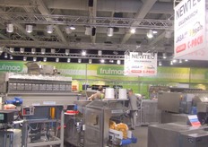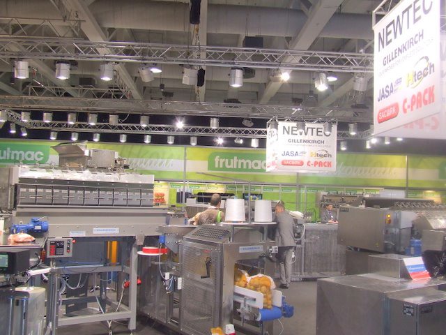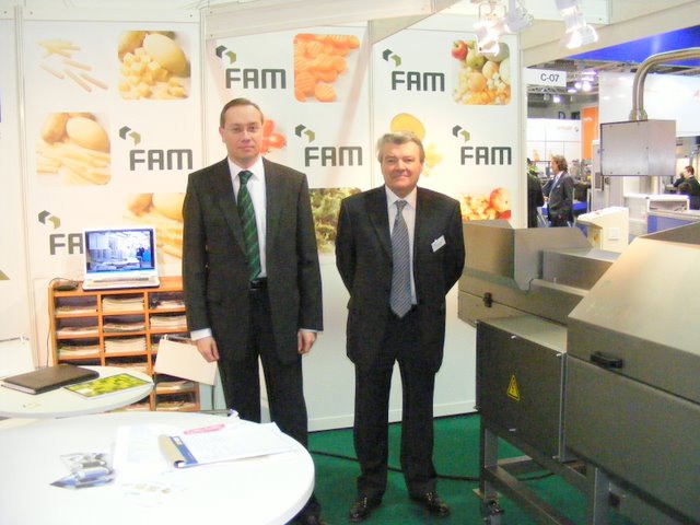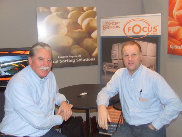 Gert Driessens en Ron Mc Veigh van Fam bij de verbeterde ILC 2. Deze snijmachine is vooral geschikt voor het strippen en in blokjes snijden van ondermeer knolgewassen, fruit en aardappelen.