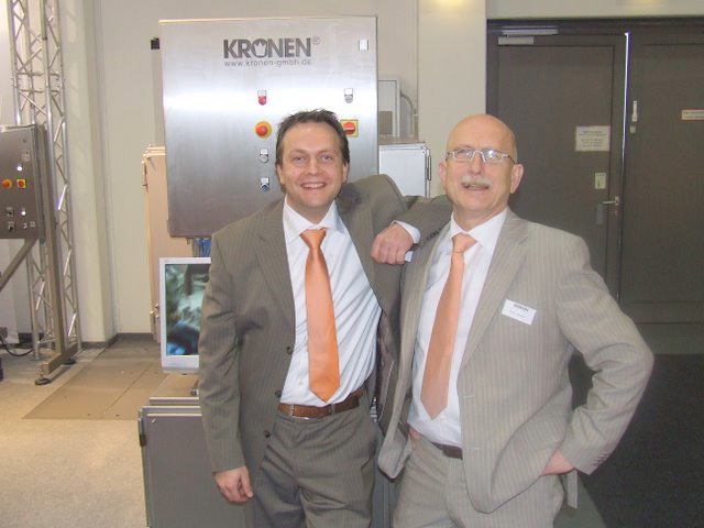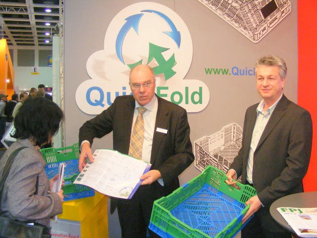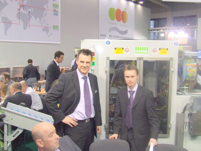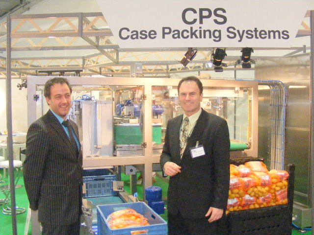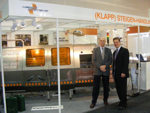 Vader en zoon John en Peter de Kiewit van Nepas Systems B.V. Als noviteit introduceren zij hun nieuwe krat opzetmachine die zowel geschikt is voor 30x40 als 60x40 kratten.