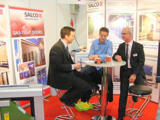 Frank Sijn en Johan Muis van Salco bedrijfsdeuren in gesprek met een klant. Er is een opkomende markt voor het volautomatisch verwerken van fruit. Salco speelt daarop in met volautomatische deuren die vries- en brandbestendig zijn en gasdicht.