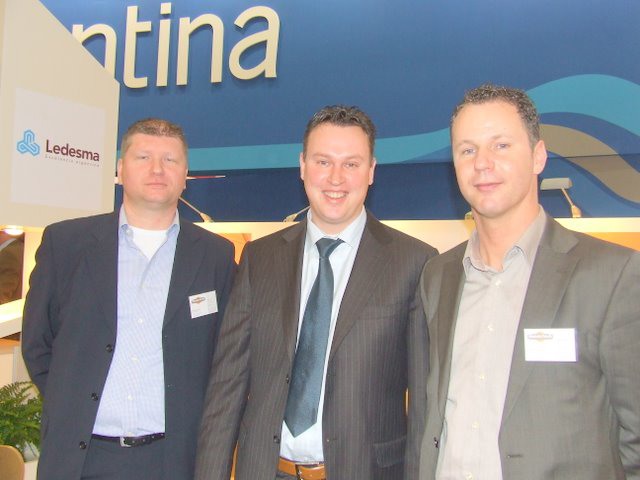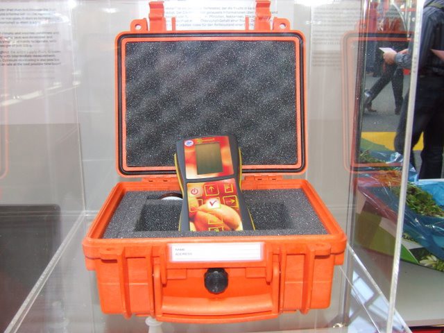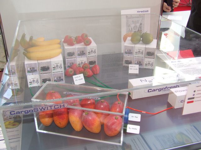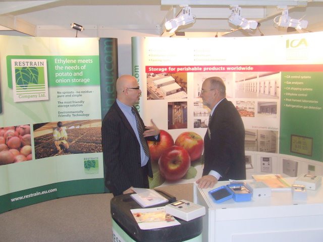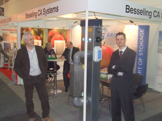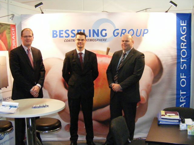 Eric van der Zwet, André van Dienst en Ton Besseling voor de nieuwe visual van Besseling Group Controlled Atmosphere. Op de beurs is de Airtox getoond. Dit is een apparaat waarbij met een beperkte hoeveelheid zuurstof in een ruimte ozon geproduceerd wordt om schimmelwerking van groente en fruit te reduceren.