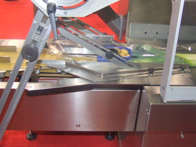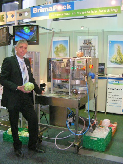 Ron van de Pavert van BrimaPack B.V. toont het nieuwe verpakkingssysteem, de VePack 200-P. Aanvankelijk is het systeem opgezet voor ijsbergsla, maar is ook geschikt voor andere produkten, zoals broccoli en bloemkool.