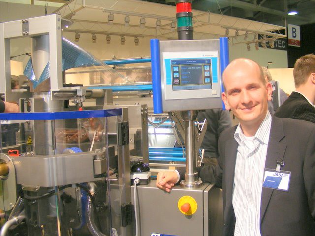 Joost Somford van Jasa staat voor de nieuwe Centurion. Deze verticale vorm-, vul- en sluitmachine kan maximaal 110 verpakkingen p/minuut produceren. Inmiddels draaien er al 15.