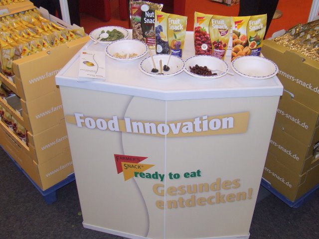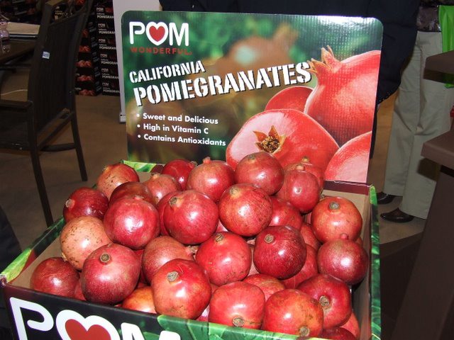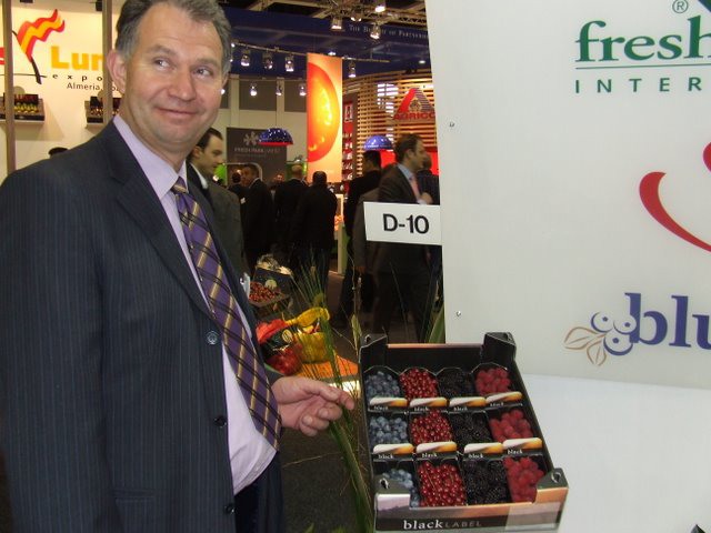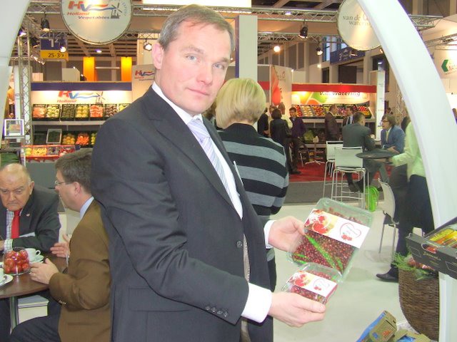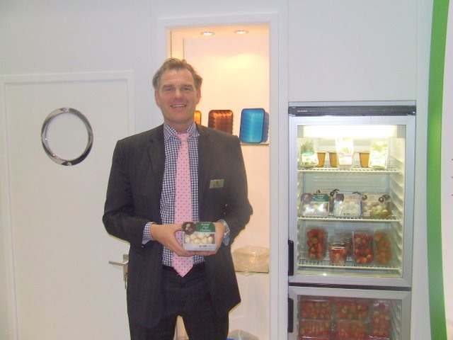 Michael Aagaard van Fruit World Breda toont de nieuwe verpakking van de granaatappelpitten die op de Fruit Logistica werden geïntroduceerd.