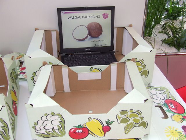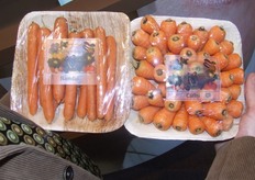 Wenke Gemmink van Fibor Packaging B.V. toont de nieuwe opzettray die momenteel veel gebruikt wordt. Deze tray is zowel in niet-watervaste als in watervaste kwaliteit te leveren. De watervaste tray bestaat uit meerdere lagen met een speciale PE-coating, waardoor het water er niet doordringt. Deze tray is daardoor erg geschikt voor vochtige groenten en fruit.