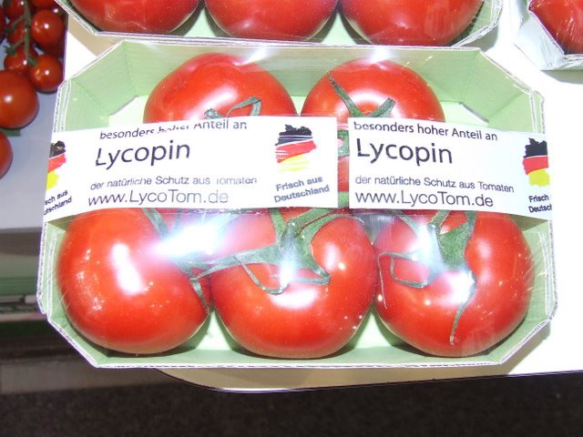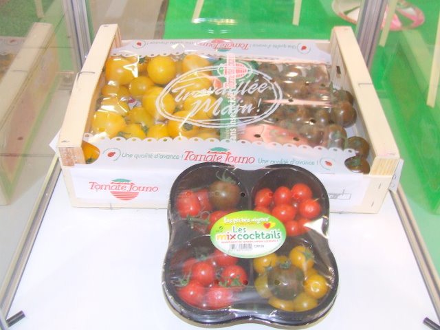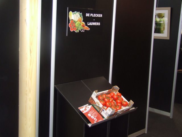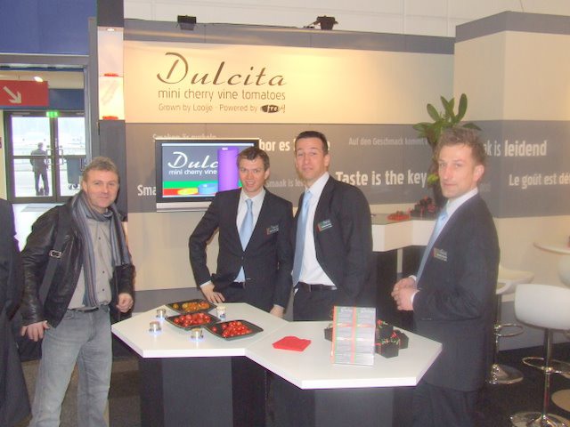 Looije had een aparte stand om de Dulcita-tomaatjes te promoten. Vlnr: Ron van der Lugt, Robbert de Jong en Michiel Bontenbal