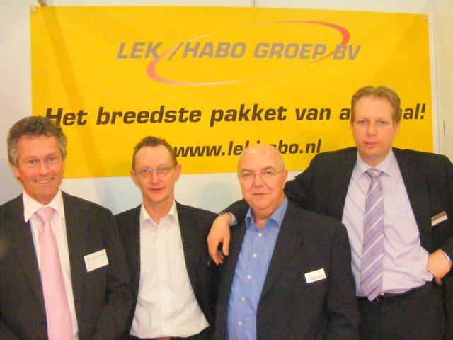 Aad de Koning, Sjaak van der Meer, Ton van Eijk en Martin van Meurs van Lek-Habo Groep. Het breedste pakket staat wat schuin op de foto. Zo lijkt hij nog meer afgevallen dan hij is (21 kg in 9 weken is knap).