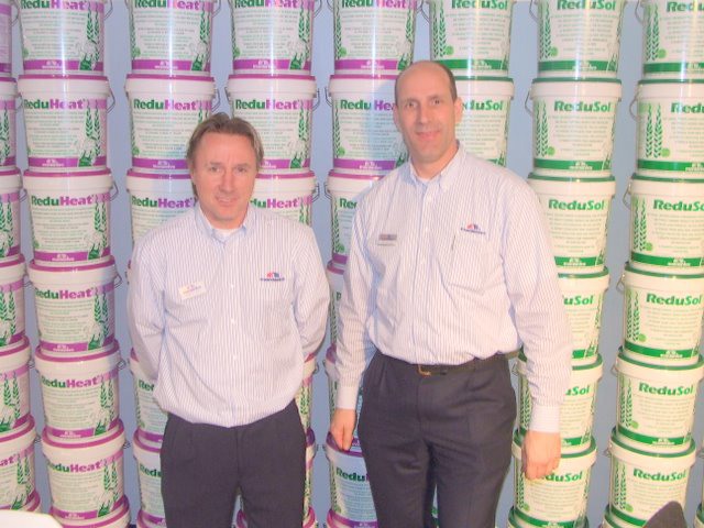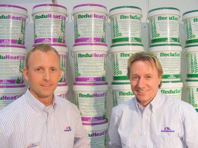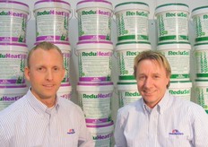 Laurens Besemer en Albert Haket van Ludvig Svensson voor de banner van Harmony. Dit doek transformeert direct licht naar diffuus licht. Het wordt gebruikt voor de opkweek van jonge groenteplanten. Er is twee jaar mee getest en het is nu een paar maanden op de markt. Bij opkweekbedrijf Van der Plas uit Maasdijk is het inmiddels geïnstalleerd.