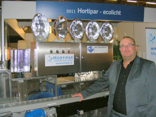 Peet van Ruyven van Hortipar voor zijn Eco Light wasstraat. Deze kan 300 armaturen per uur wassen. De eerste machine draait inmiddels.