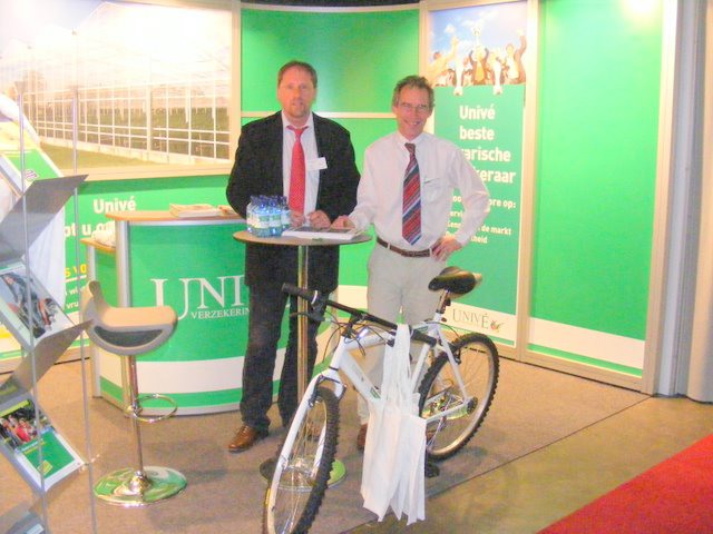 Dick Dijkman en Rens Varekamp van Univé verloten een fiets onder de correcte inzendingen op hun prijsvraag.