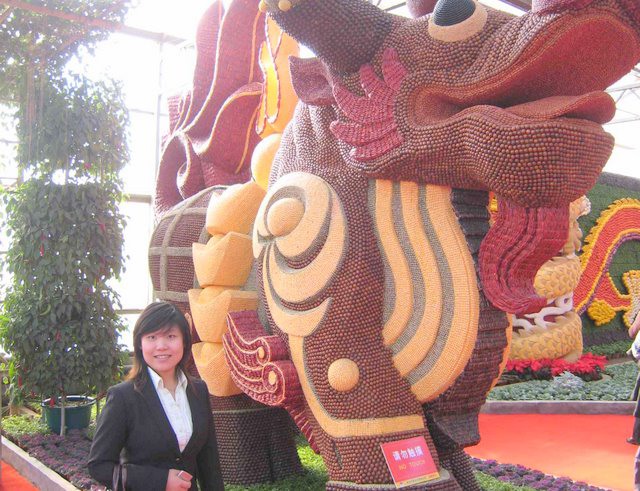 "Jing Xing van Rijk Zwaan poseert voor een met zaden versierde koe, die dit jaar centraal staat vanwege "year of the cow"."