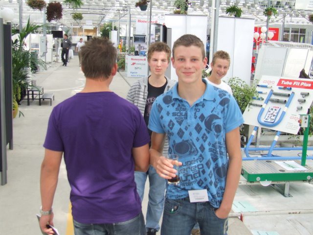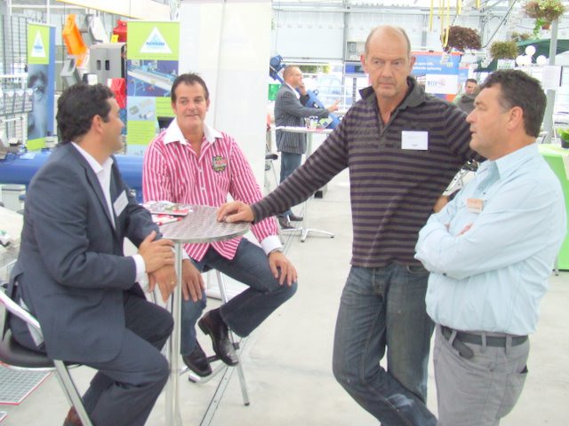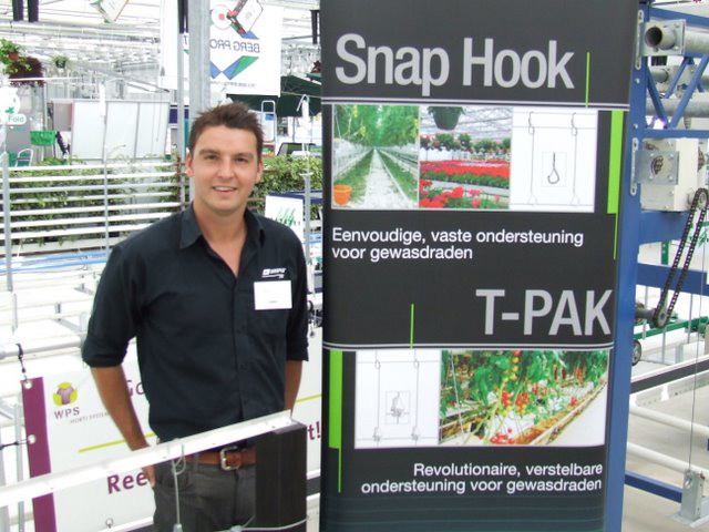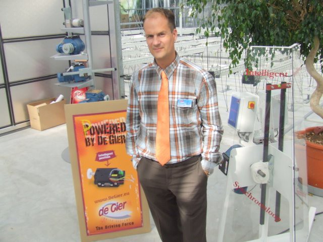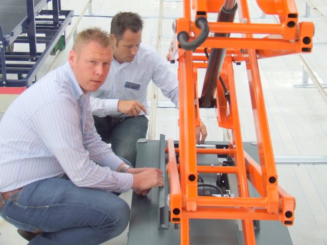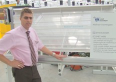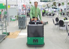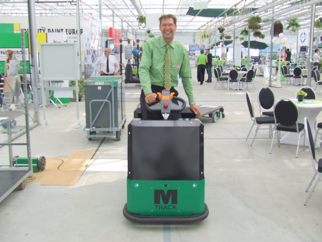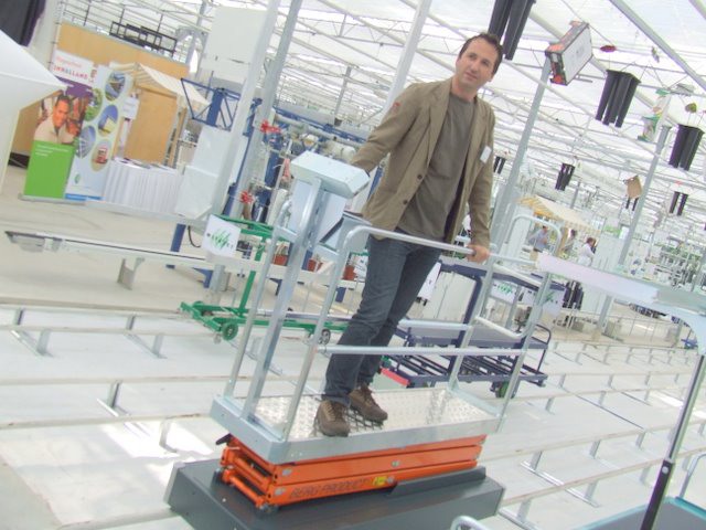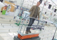 Silvester Weterings van Berg Product op een van de buisrailwagens. Tijdens de Horti Fair introduceren ze de vierschaar.