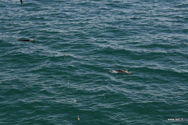 Als je beet hebt is het maar de vraag wie het snelst is: jij die de vis wilt binnenhalen of de zeehonden.