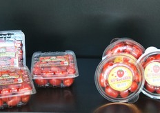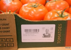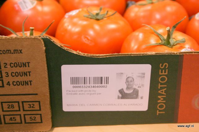 De dame die de tomaten verpakt heeft staat op de verpakking