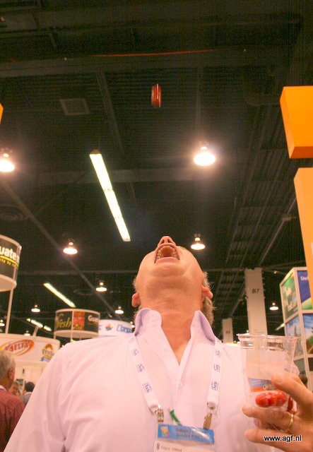 Arjan Haagoort probeert een tomaat in zijn mond te gooien. En of het lukte? natuurlijk niet!