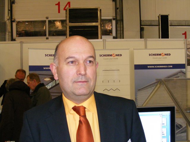 Carl van Schermned laat zien dat insectengaas zowel aan de binnenkant als aan de buitenkant kan worden gemonteerd. Er stond een kasopstelling in de stand.