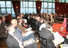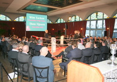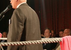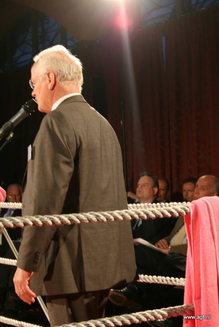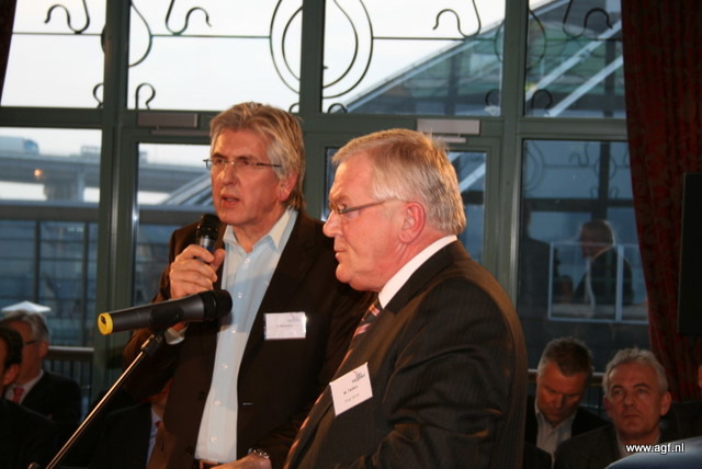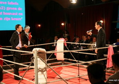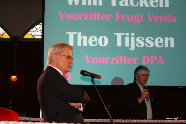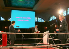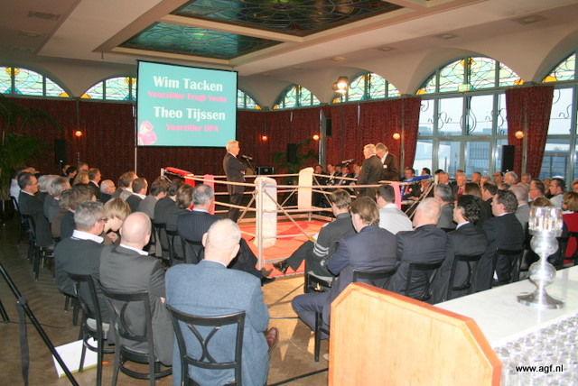 Wim Tacken (FrugiVenta) en Theo Tijssen (DPA) beten de spit af in de boksring tijdens het AGF-Debat 2010. De voorzitters blikten terug op 2009 en keken vooruit naar het nieuwe jaar.