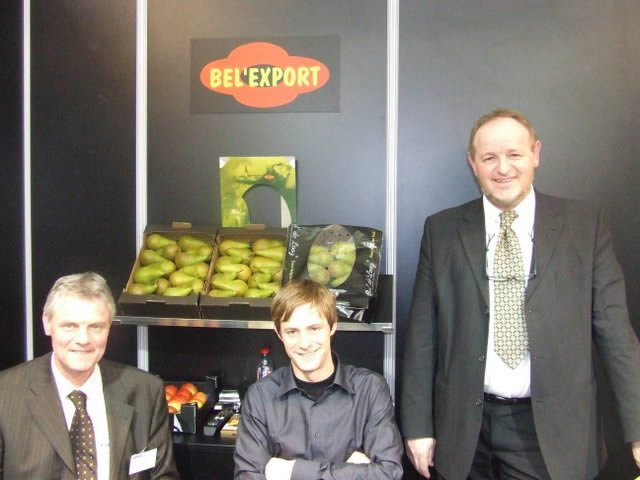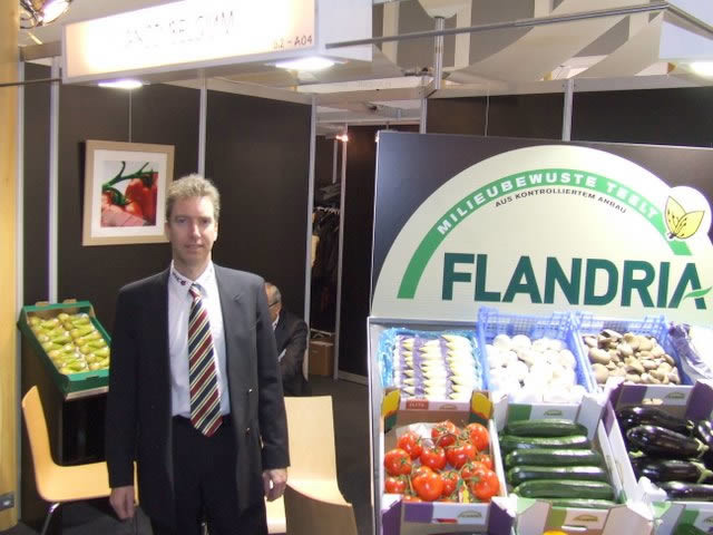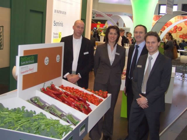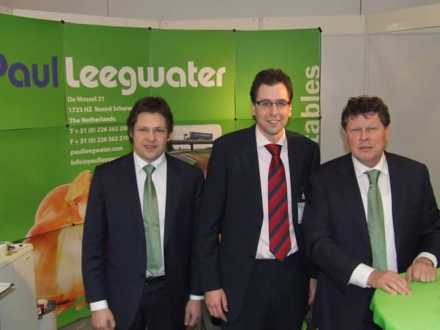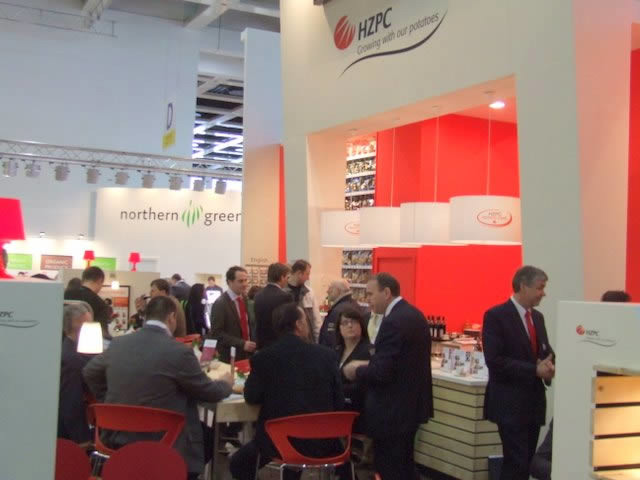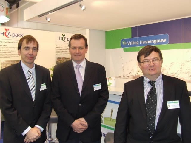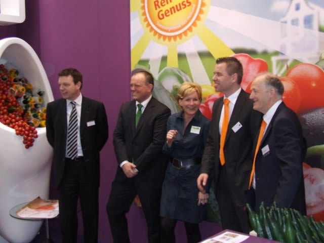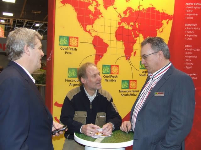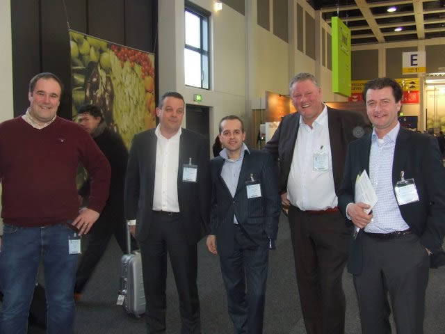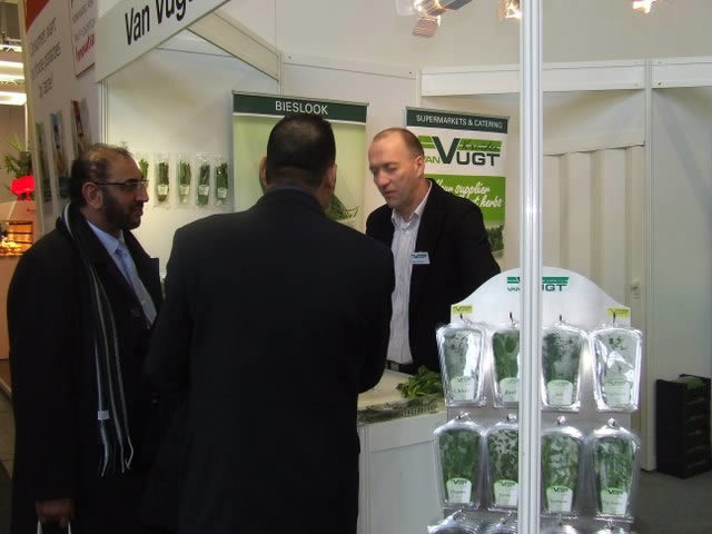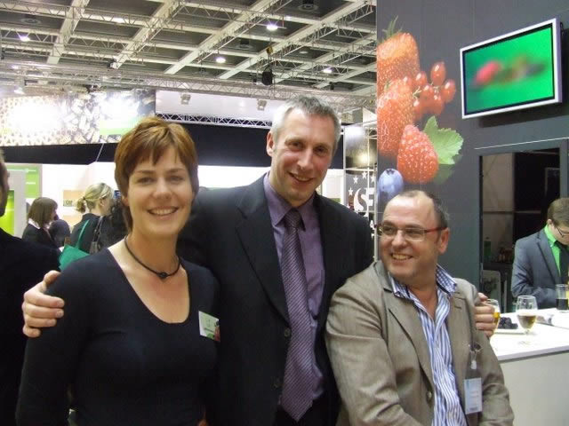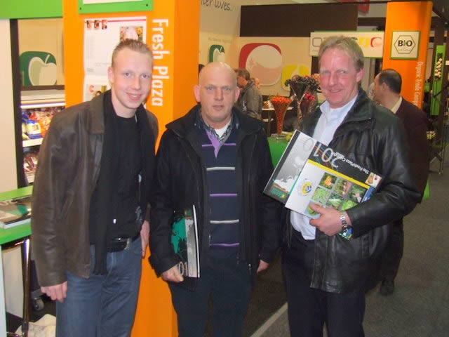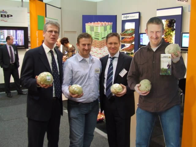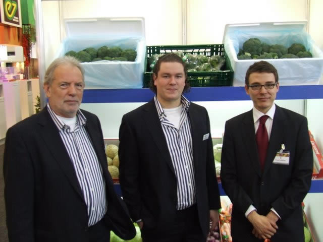 Tim Kenter en Gerard Breed van JH Wagenaar hadden 'Bauer Ted' (midden) meegenomen naar Berlijn. Ted Vaalburg heeft jarenlange ervaring in de knolselderijteelt en vindt het van groot belang om een natuurlijk geteeld product aan te bieden.