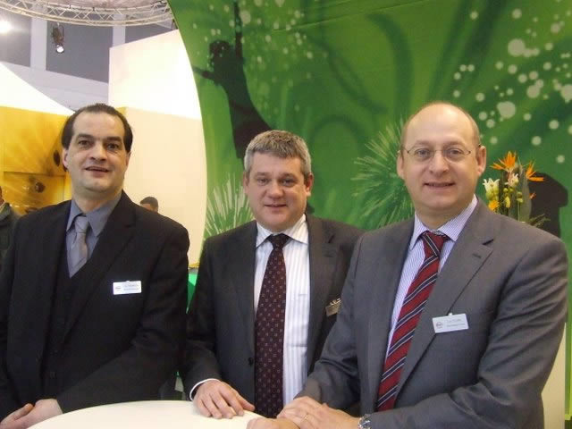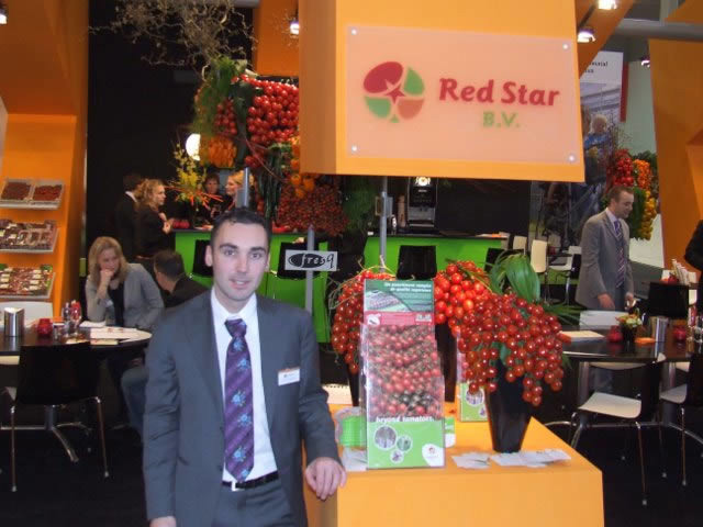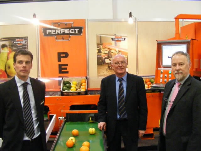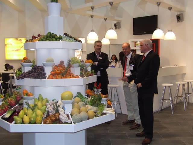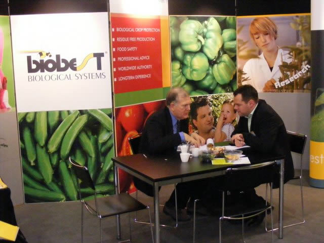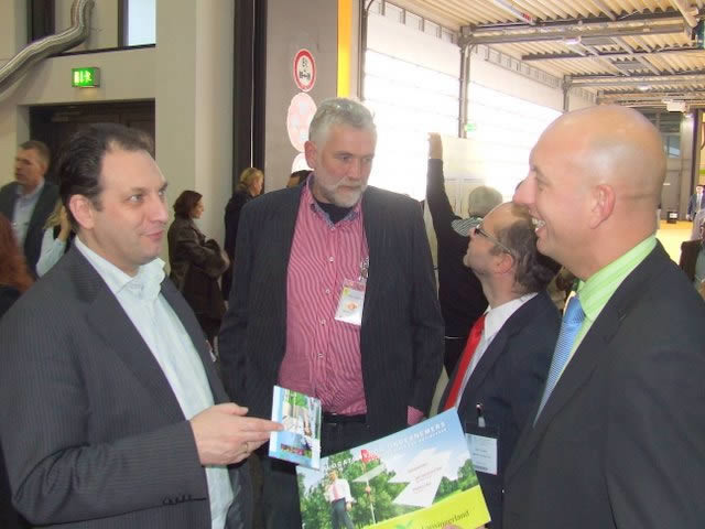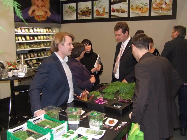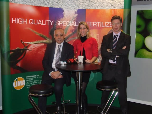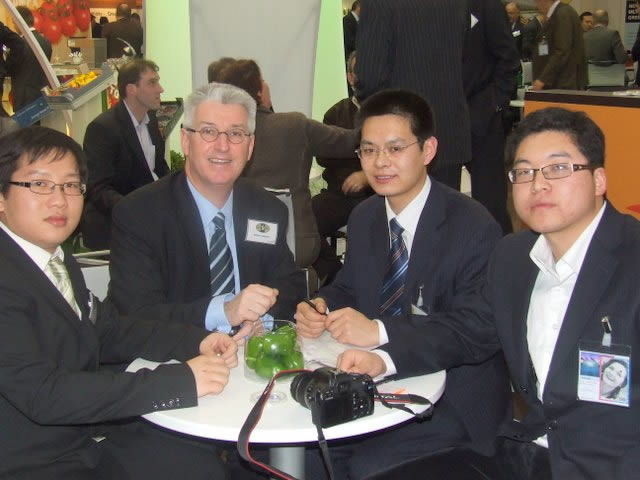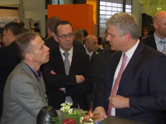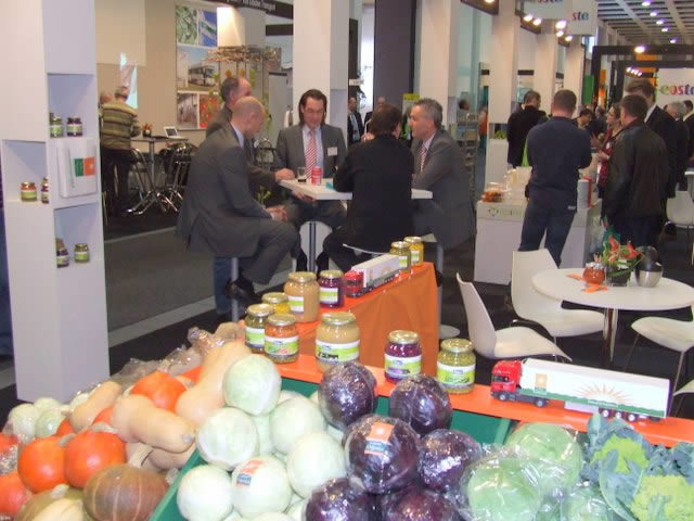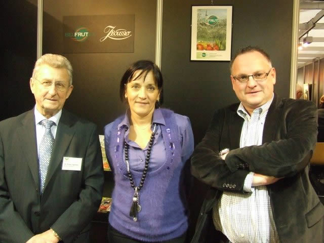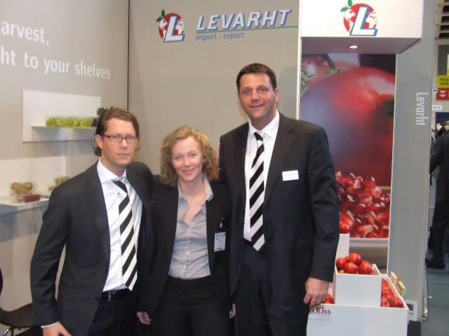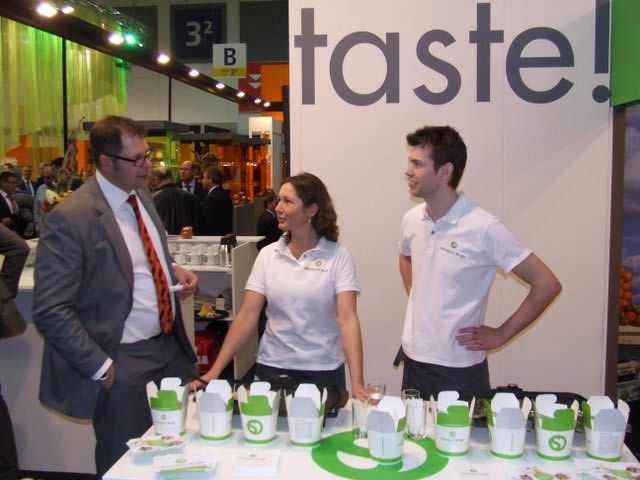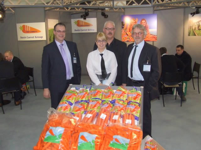 Tim Kenter en Gerard Breed van JH Wagenaar hadden 'Bauer Ted' (midden) meegenomen naar Berlijn. Ted Vaalburg heeft jarenlange ervaring in de knolselderijteelt en vindt het van groot belang om een natuurlijk geteeld product aan te bieden.