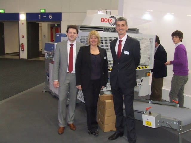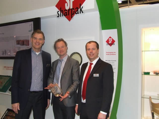 Arjan Hagoort, Alexander Plasschaert en Leo Verhuizen van Sharpack tonen de nieuwe SPS 500. Deze verpakking is gemaakt van 50-80% recyclebaar materiaal, en heeft o.a. een groot logistiek voordeel.