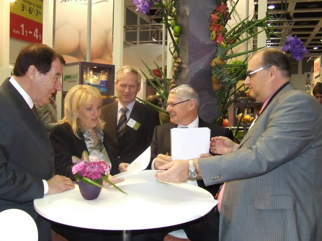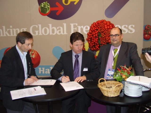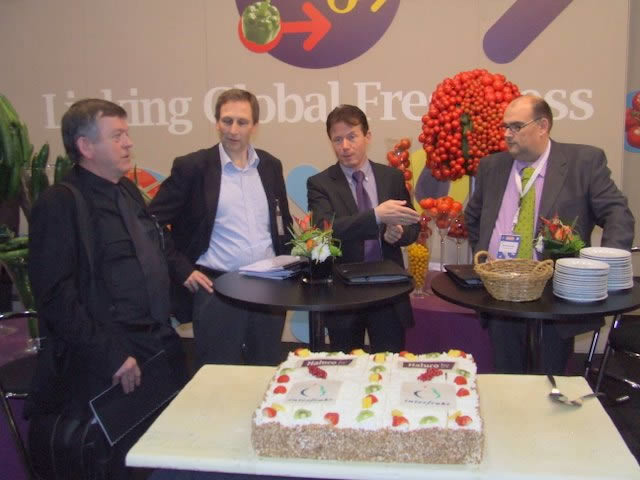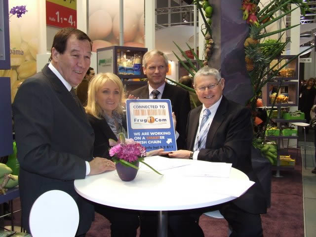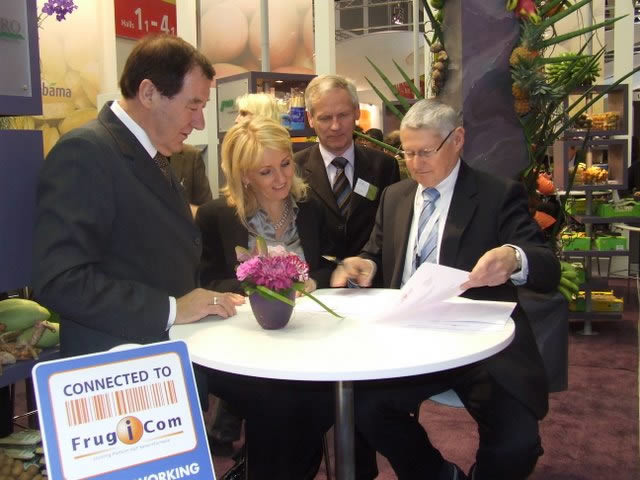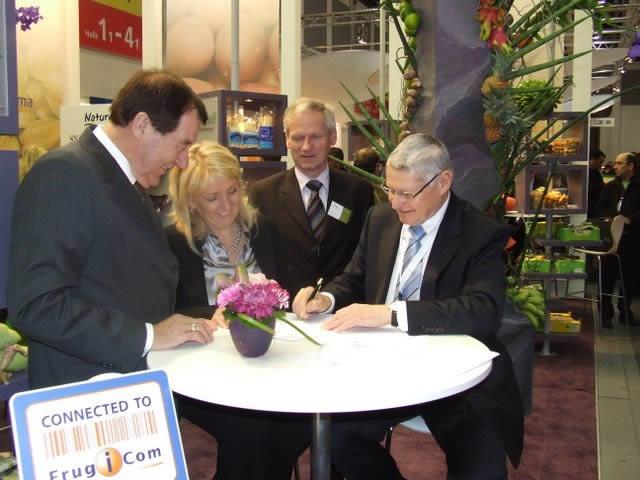 Interfrukt Oslo en Haluco tekenden een convenant, dat beide partijen ertoe verplicht om in 2010 elektronische gegevensuitwisseling tot stand te brengen door middel van de GS1 standaard met behulp van Frug I Com en de Norges Frukt- og Gronnsaksgrossisters Forbund. Rechts: Johan Hensen van Haluco en Harrij Schmeitz van Frug I Com
